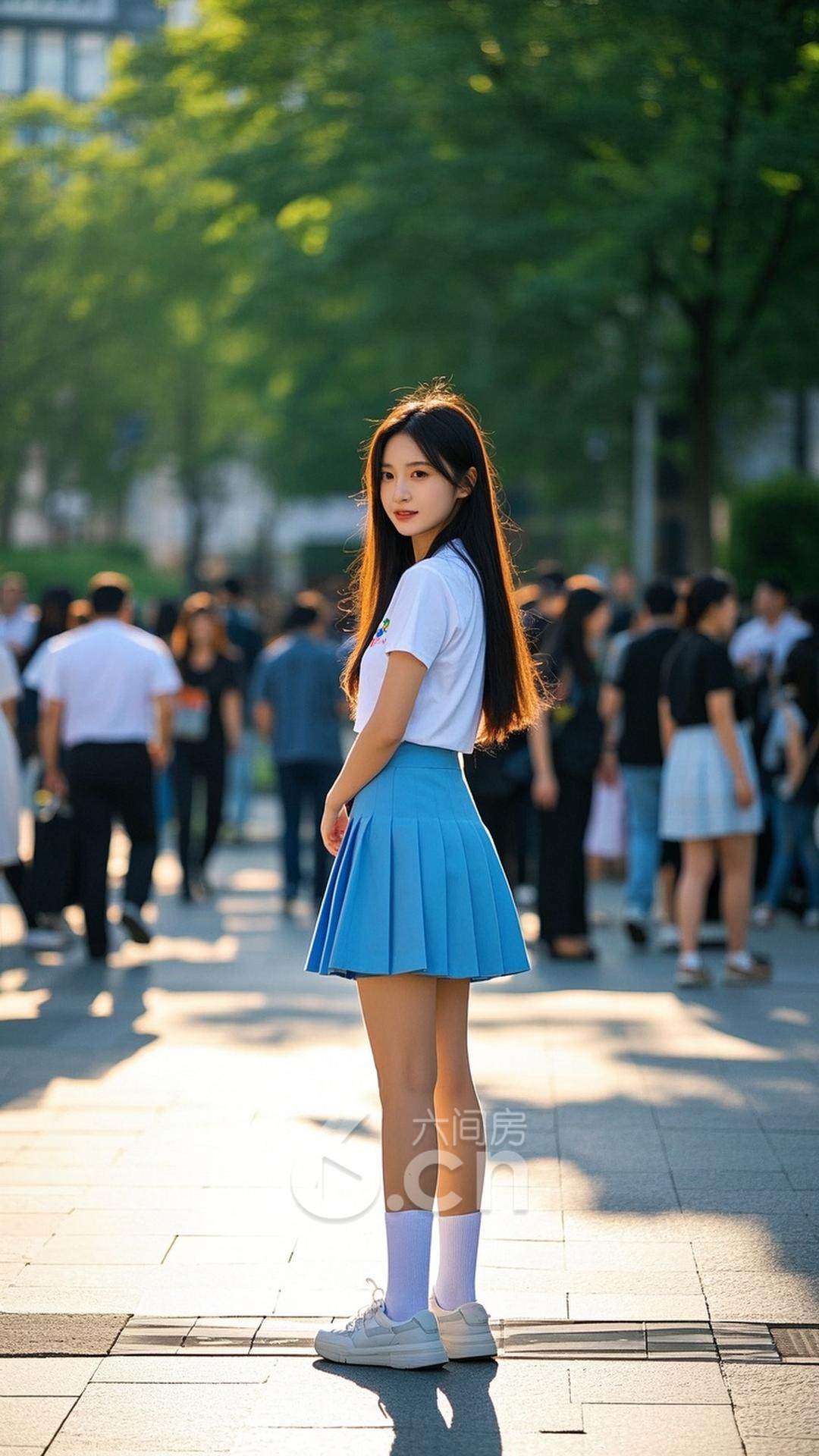 一位年轻的中国女性,穿着浅蓝色短裙与白色T恤,长发披肩,站在春天的城市广场,背景是温暖的阳光与人群,展现她的青春与自然气息