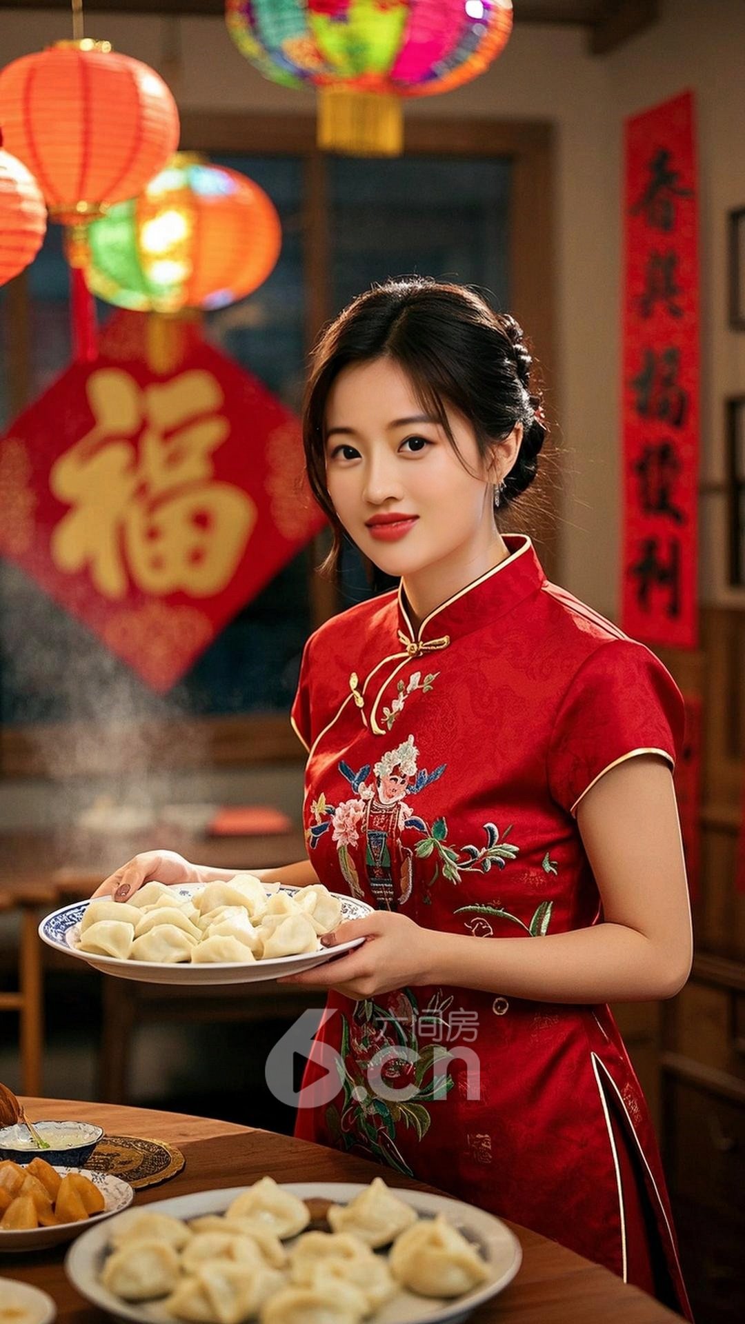 一个漂亮的中国年轻女人,皮肤白皙,穿着传统红色刺绣裙,站在家庭聚餐的餐桌前,背景是春节的装饰物,如春联,福字,灯笼等,她微笑着手持一盘饺子,眼中闪烁着对团圆的喜悦,充满了浓厚的春节气息