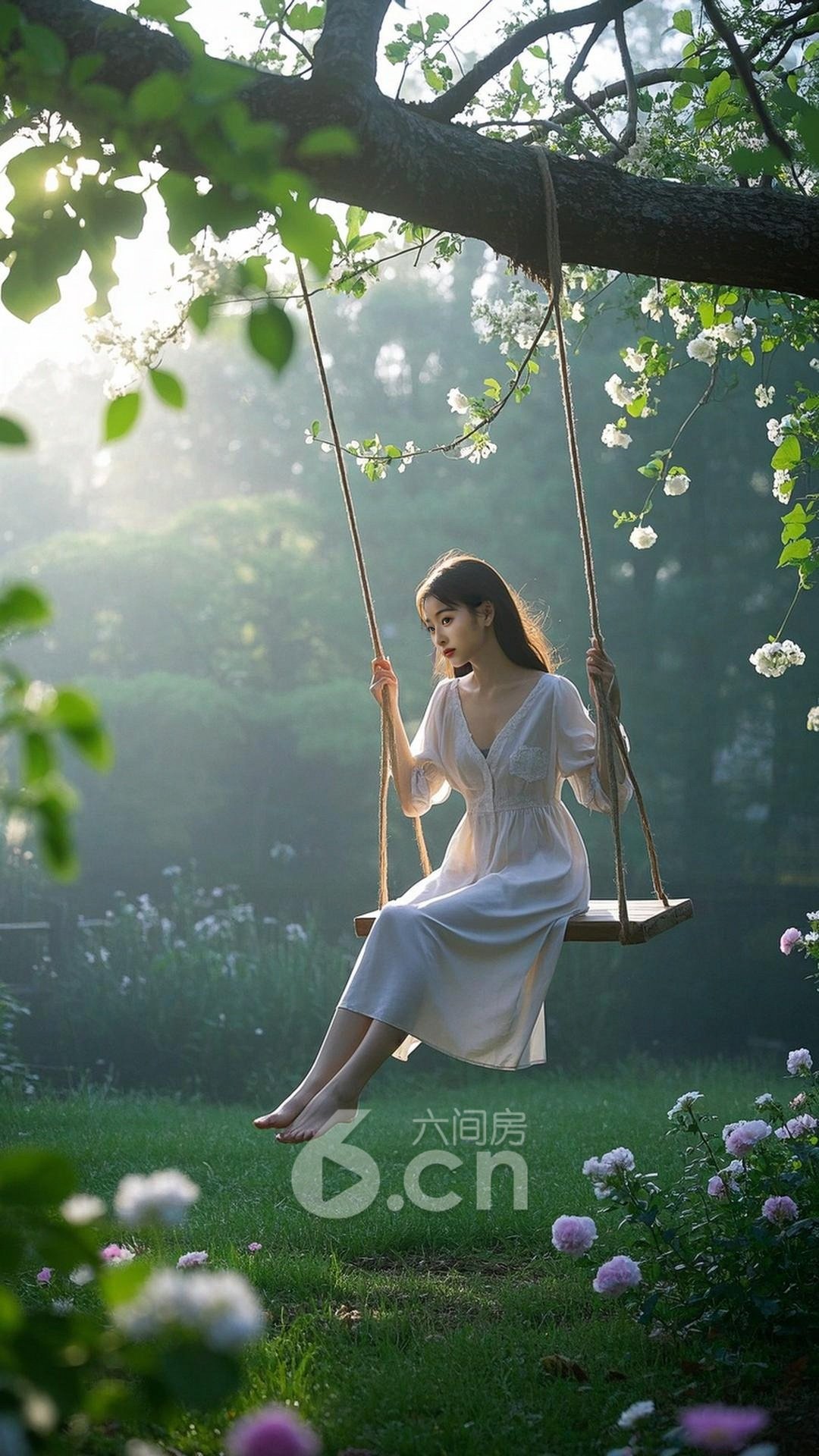 夜刀守巳下载无水印版一个漂亮的中国年轻女人,皮肤白皙,穿着睡衣,坐在花园的秋千上,四周是盛开的鲜花和清晨的薄雾,镜头从远景拍摄,捕捉她在花园中的宁静与轻风,高清相机,远景,春季,花园夜刀守巳共有0条评论