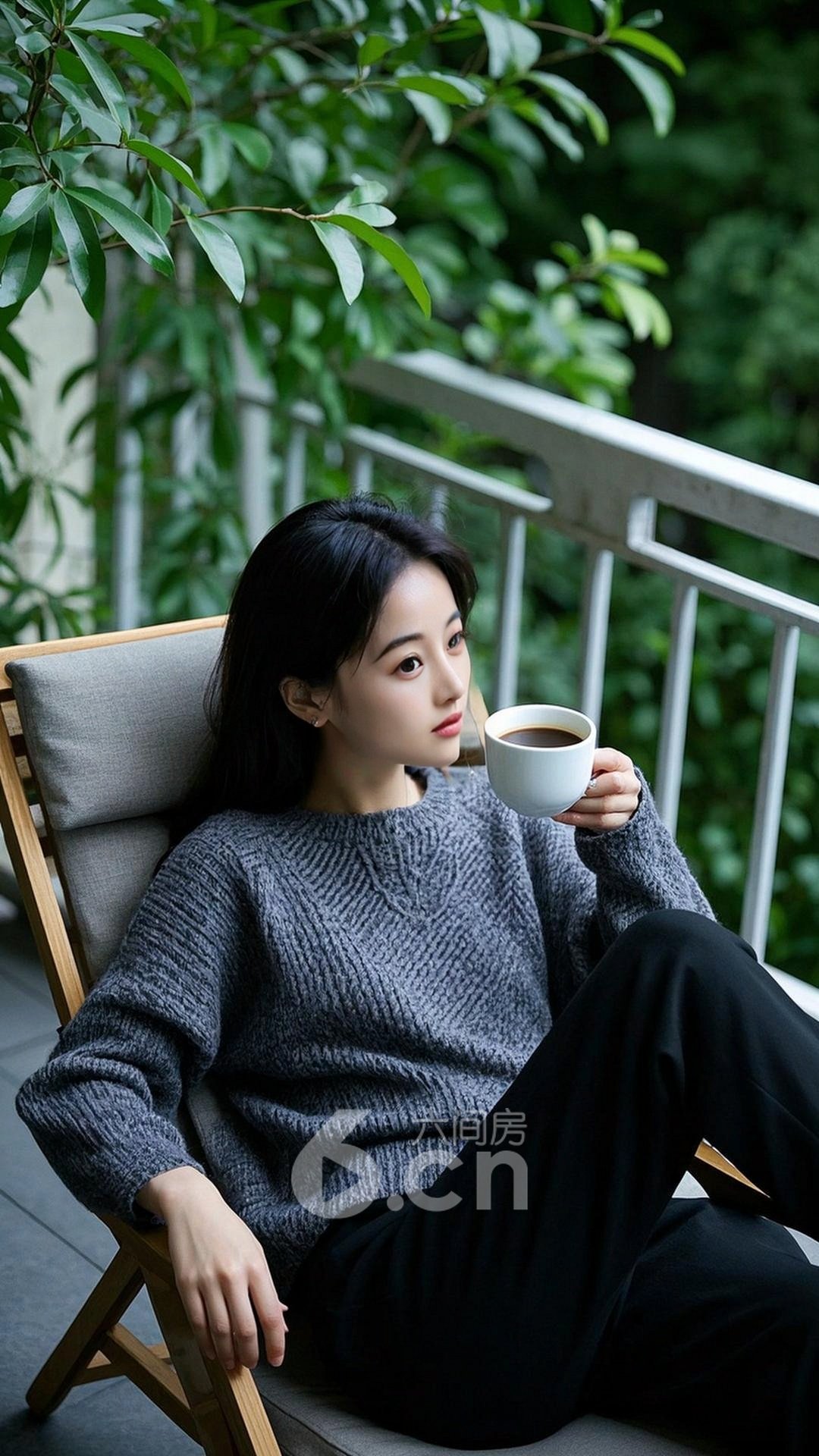夜刀守巳下载无水印版一个漂亮的中国年轻女人,皮肤白皙,穿着深灰色针织衫和黑色长裤,坐在阳台的躺椅上,手中拿着一杯咖啡,背景是充满绿色植物的花园,阳光透过树叶洒下,整个画面充满悠闲,安静的氛围夜刀守巳共有0条评论