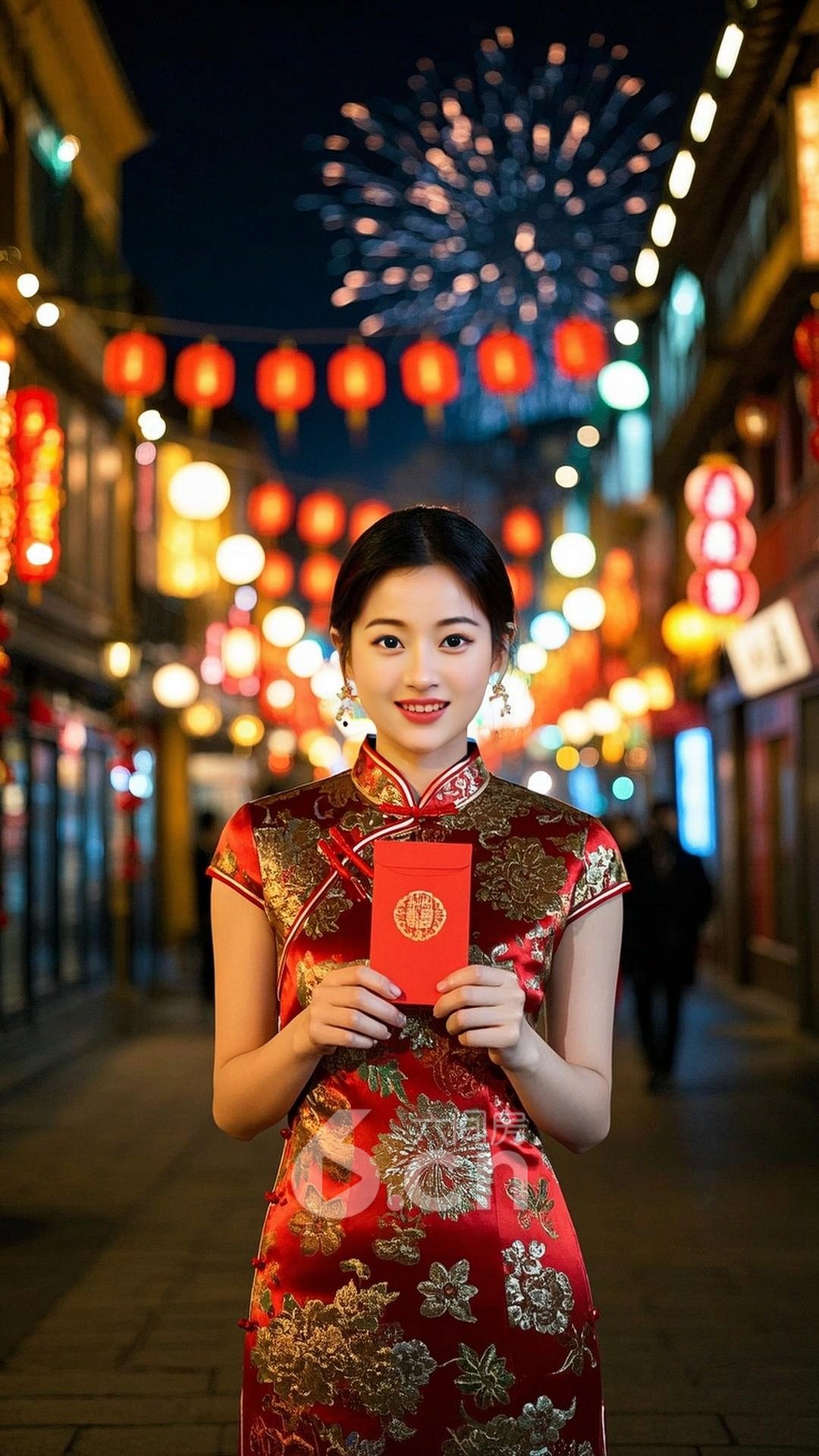 夜刀守巳下载无水印版一个漂亮的中国年轻女人,皮肤白皙,穿着红色和金色相间的旗袍,背景是春节的街道上,街灯,烟花和红色灯笼映衬着她的笑脸,她手持红包,笑容灿烂,整个人散发着春节的欢乐和祥和气息夜刀守巳共有0条评论