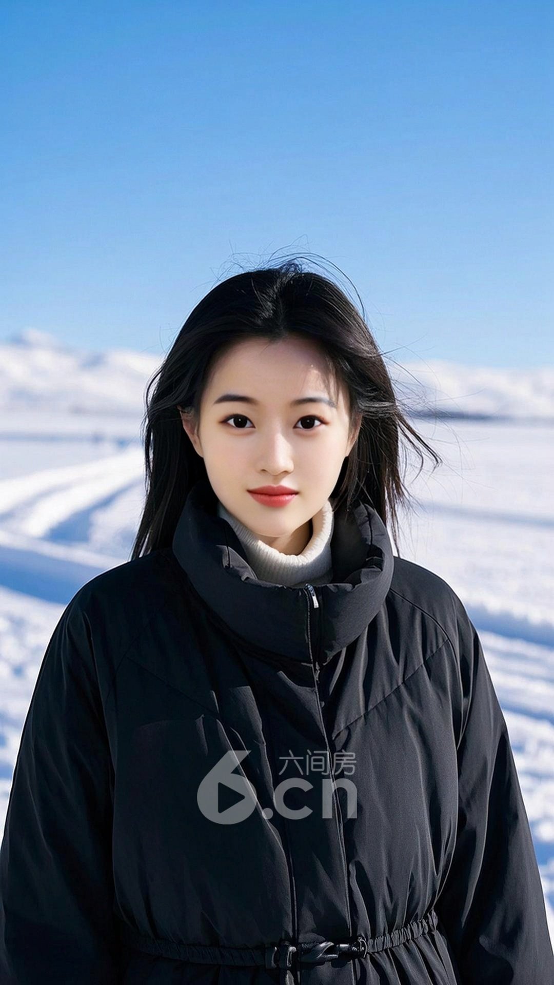 一个漂亮的中国年轻女人,皮肤白皙,穿着黑色羽绒服,站在雪地中,镜头正面捕捉她微笑的面容,背景是洁白的雪地和蓝天,整幅画面展现了冬季的清冷与女性的柔美