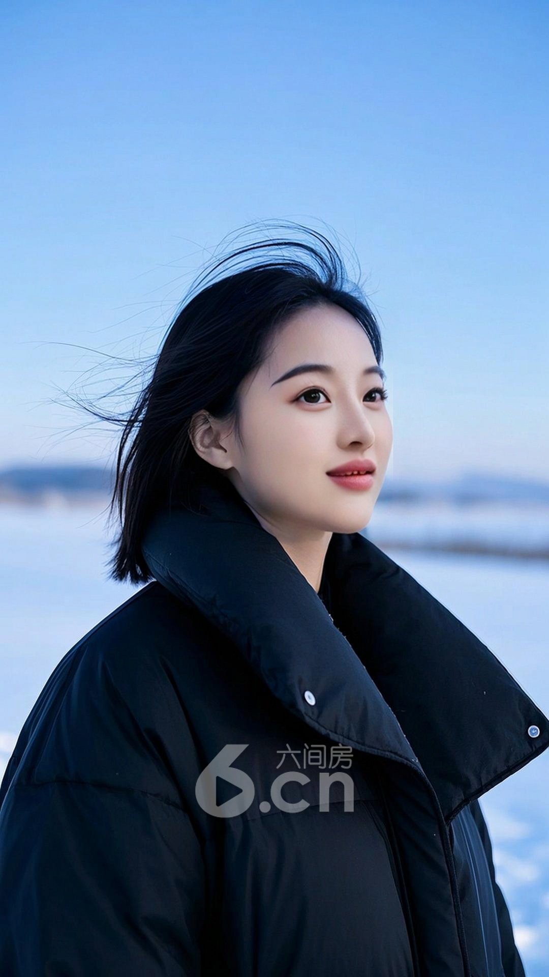 一个漂亮的中国年轻女人,皮肤白皙,穿着黑色羽绒服,...