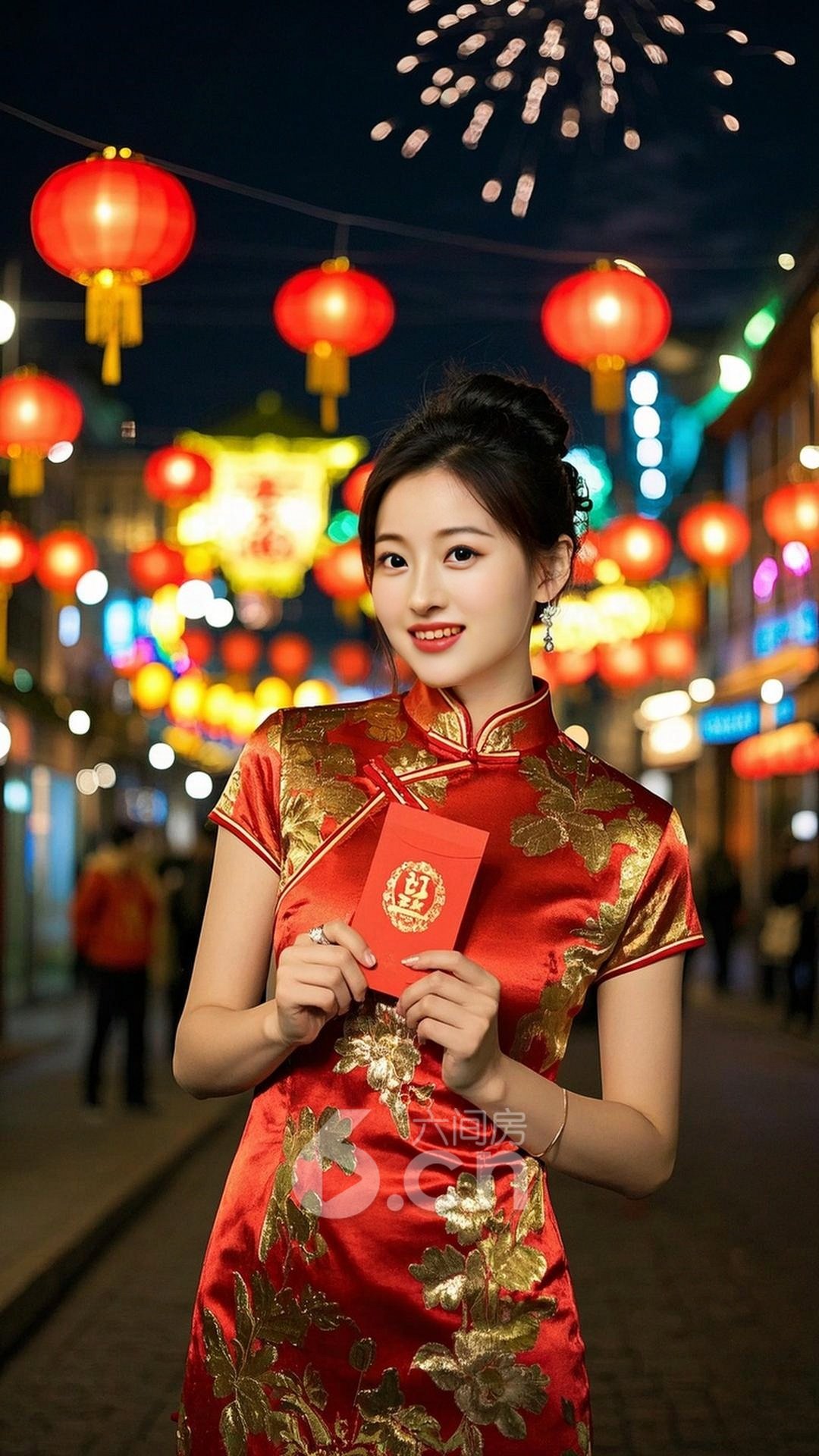 一个漂亮的中国年轻女人,皮肤白皙,穿着红色和金色相间的旗袍,背景是春节的街道上,街灯,烟花和红色灯笼映衬着她的笑脸,她手持红包,笑容灿烂,整个人散发着春节的欢乐和祥和气息