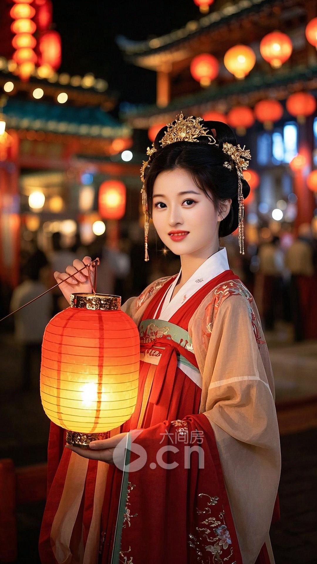 一个漂亮的中国年轻女人,皮肤白皙,穿着红色汉服,头饰金色,站在春节的古风庙会背景中,周围是一片传统文化的元素,她微笑着,手持一盏红色灯笼,展现出浓浓的传统节日气息