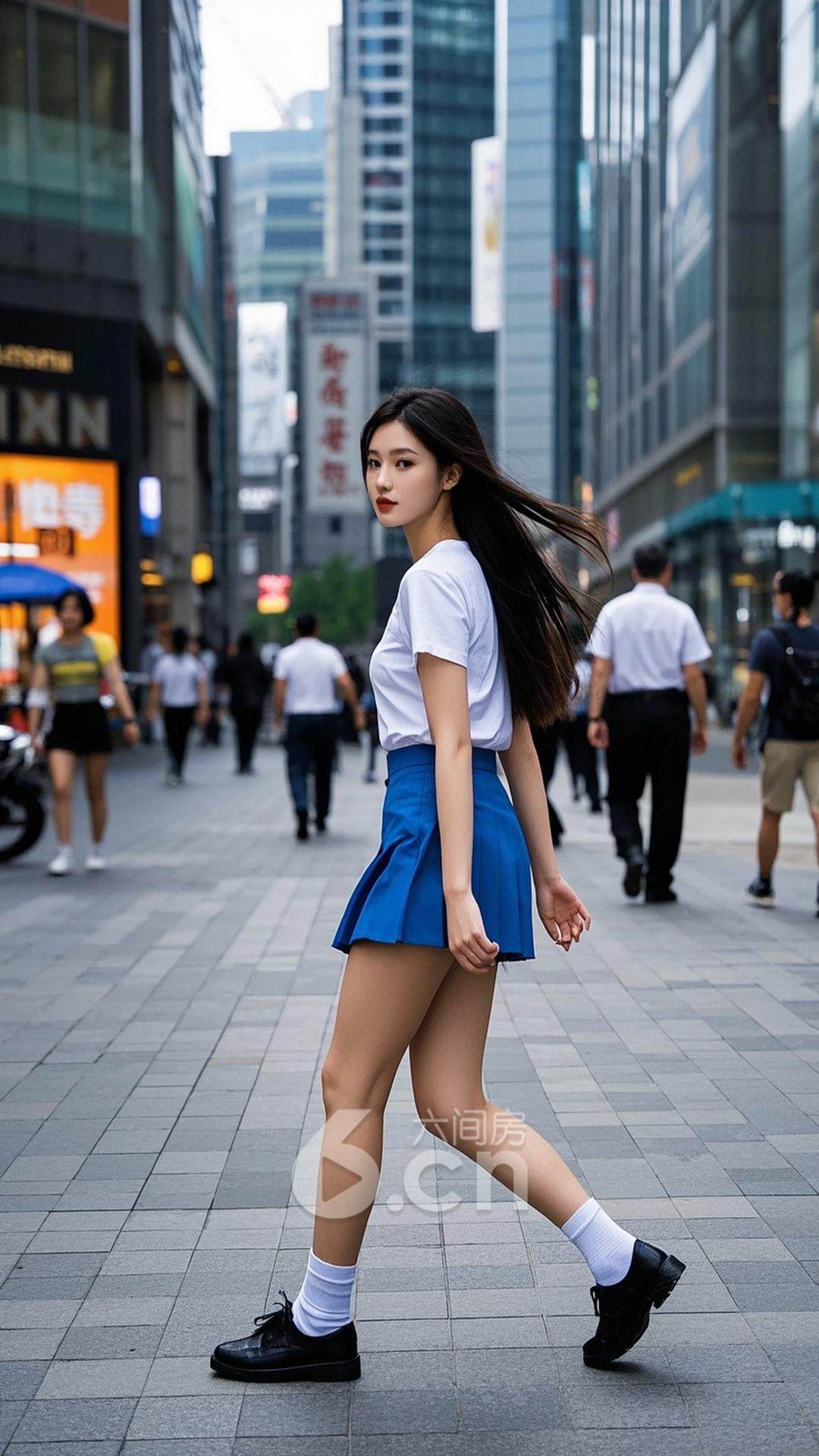 一位年轻的中国女性,穿着简约的蓝色短裙和白色T恤,长发随风飘动,长腿修长,正走在城市的街头,背景是繁忙的商业街和现代化建筑,展现她的青春与时尚感