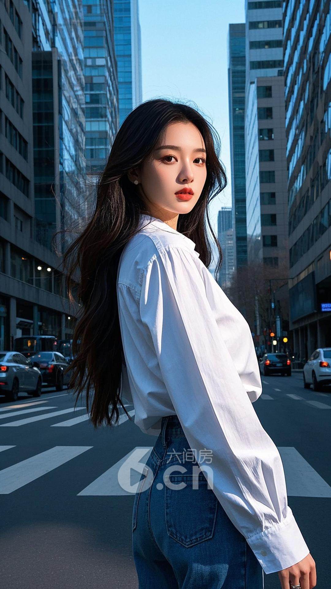 一位穿着白色衬衫和牛仔裤的中国女性,长发自然披肩,长腿修长,正站在城市街头,背景是现代化的建筑和繁忙的街道,展现她的青春与现代时尚感