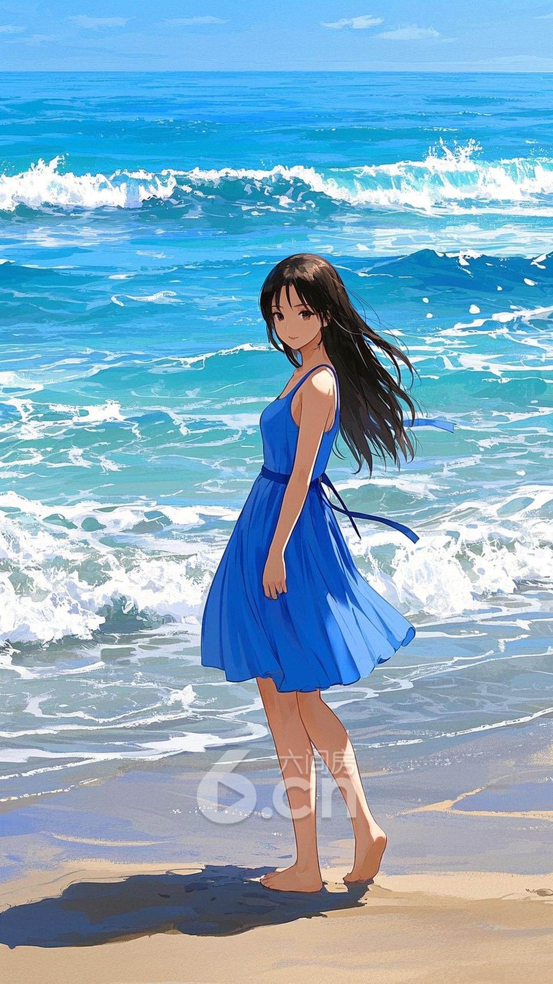 一位女性,穿着蓝色的夏季裙子,长发自然垂落,站在海滩边,背景是波浪与沙滩,展现她的青春与动漫风格的清新感