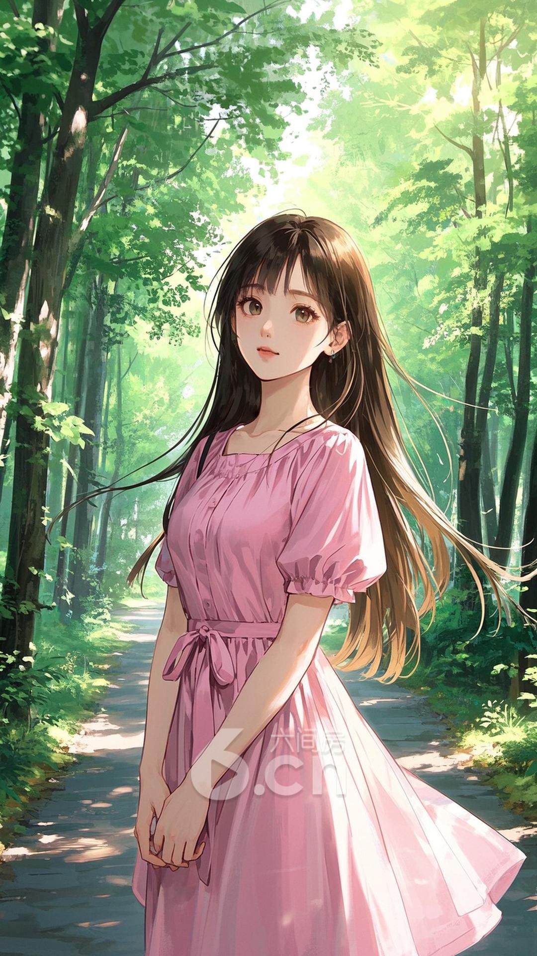 一位年轻的女性,穿着可爱的粉色连衣裙,长发自然垂落,站在森林的小道上,背景是阳光透过树叶洒下的光斑,展现她的可爱与温柔气质