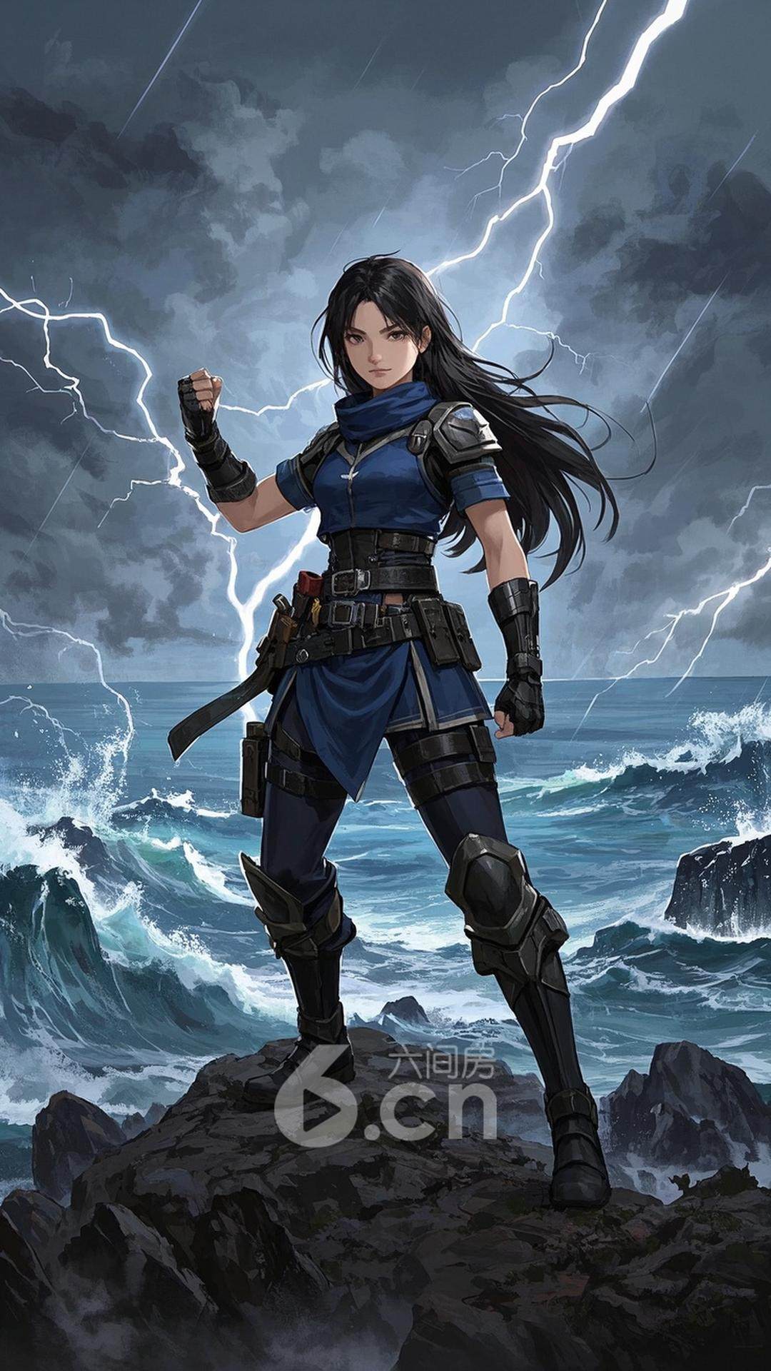 一位女性,穿着深蓝色的战斗服,长发高束,站在远方的高山之巅,背景是波涛汹涌的海洋与雷电交加的天空,展现她的勇气与英勇