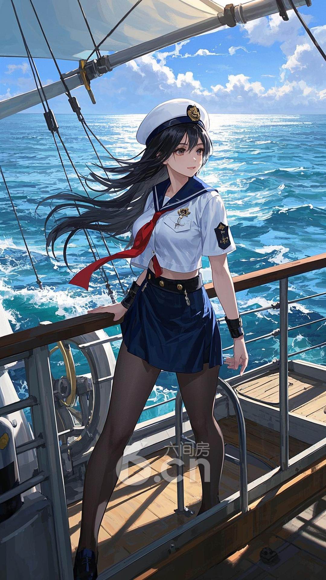 一位女性,穿着海军制服,长发随风飞扬,站在航船的甲板上,背景是波涛汹涌的大海与阳光,展现她的英姿与勇气