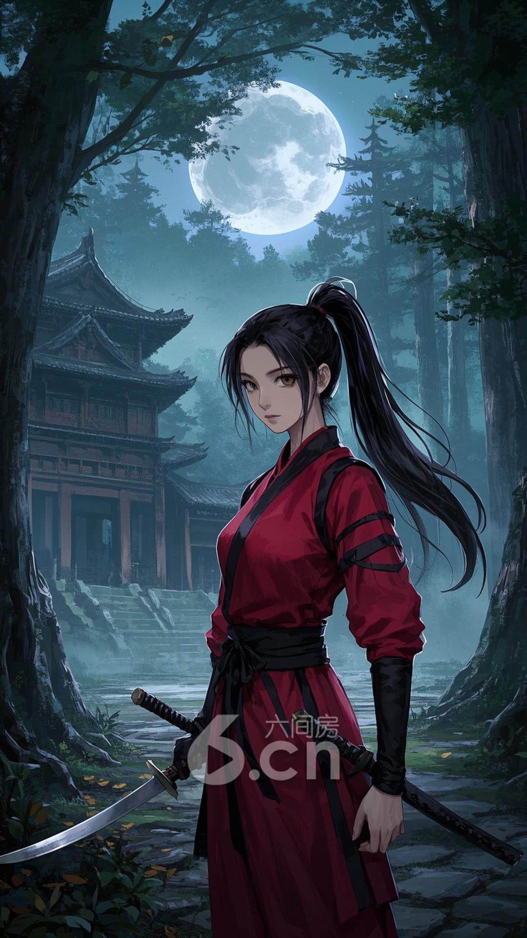一位年轻的女性,穿着红色忍者服,长发高束,站在古老的寺庙前,背景是阴暗的森林和朦胧的月光,展现她的灵活与勇气