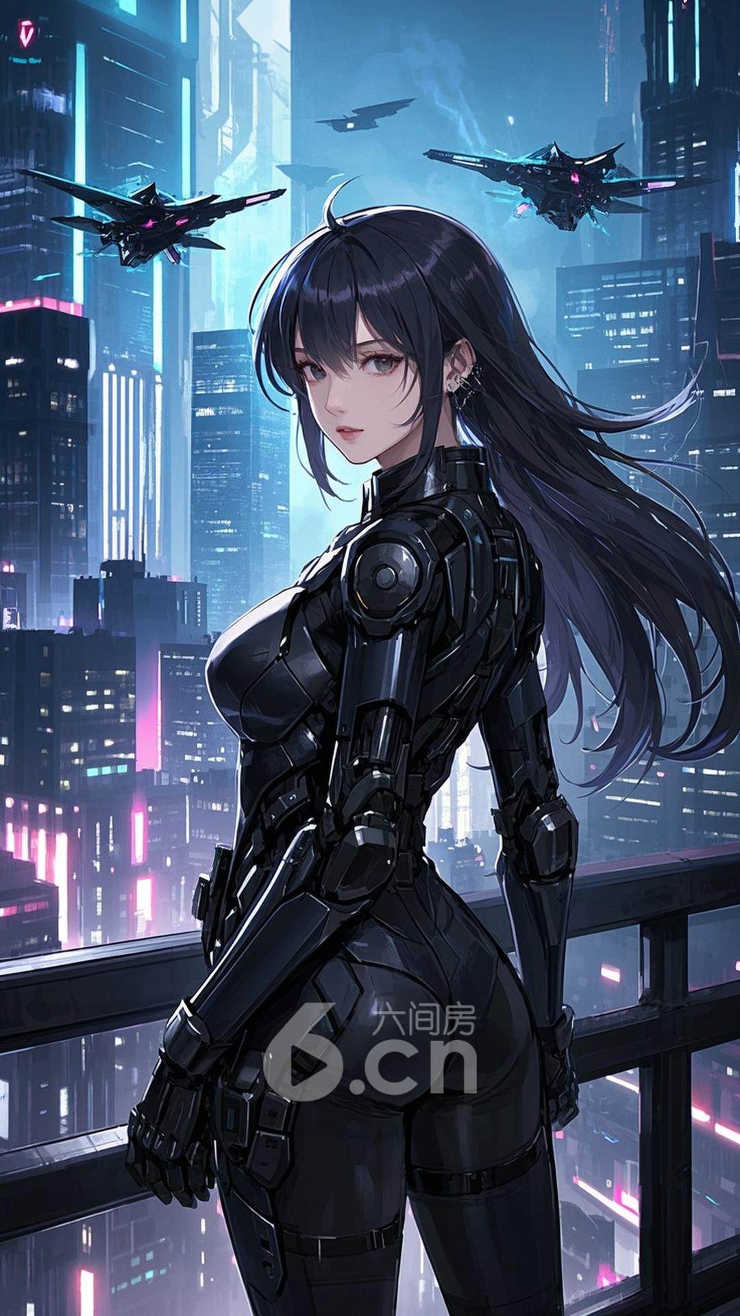 一位女性,穿着黑色机甲战衣,长发束起,站在未来城市的屋顶,背景是闪烁的霓虹灯与飞行器,展现她的战斗精神与科技感