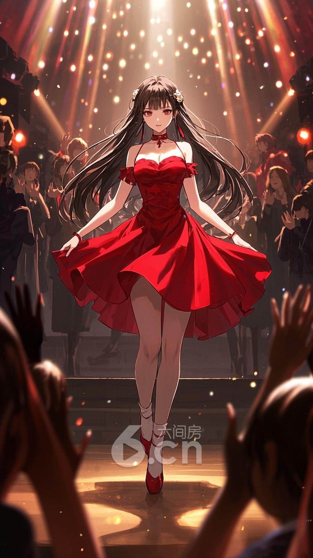 一位年轻的女性,穿着红色舞裙,长发自然垂落,站在舞台中央,背景是绚烂的灯光与热烈的掌声,展现她的舞蹈才华与自信
