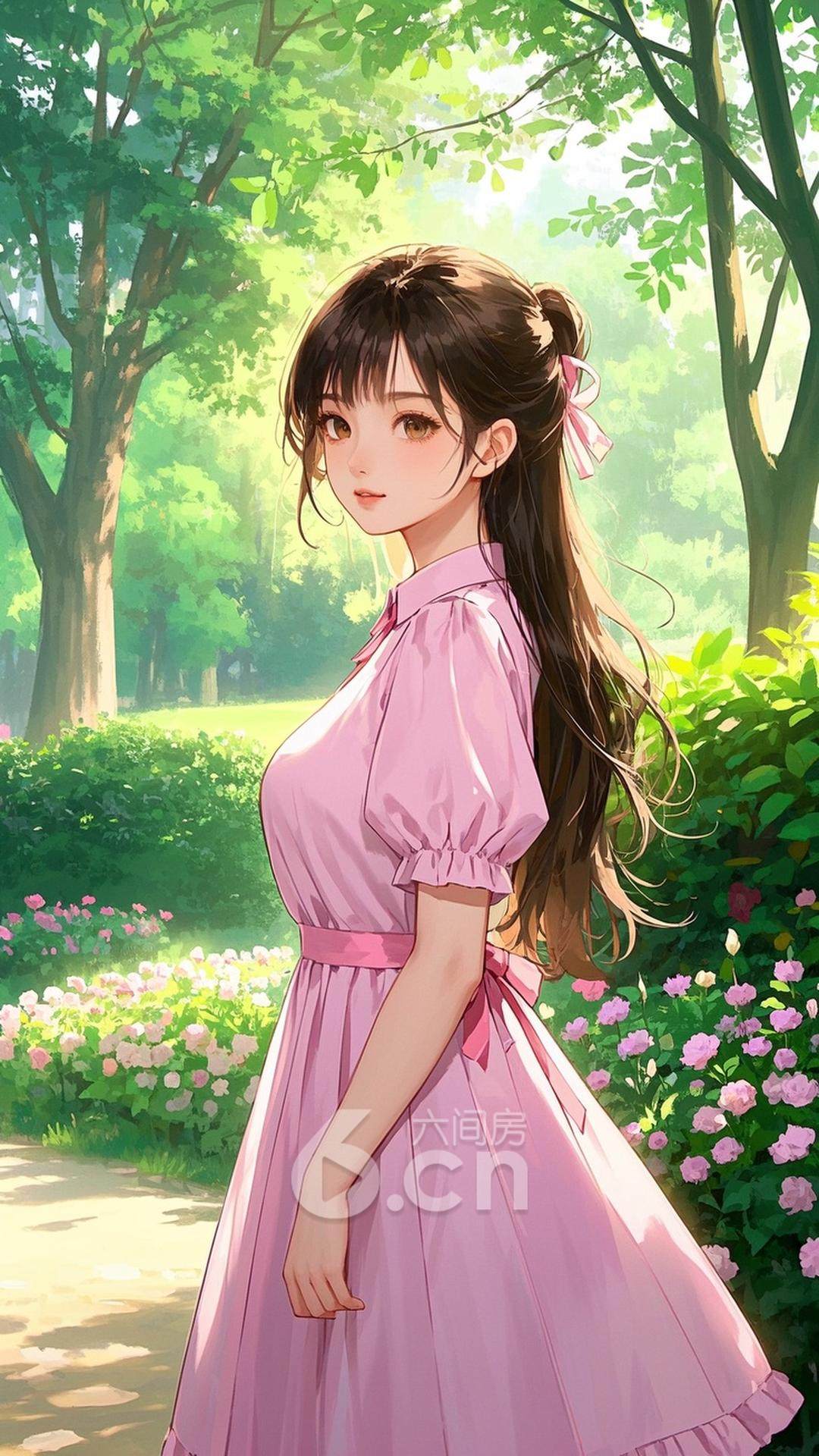 一位年轻的女性,穿着粉色连衣裙,长发高束,站在阳光下的公园里,背景是绿意盎然的树木与开满鲜花的花坛,展现她的甜美与清新