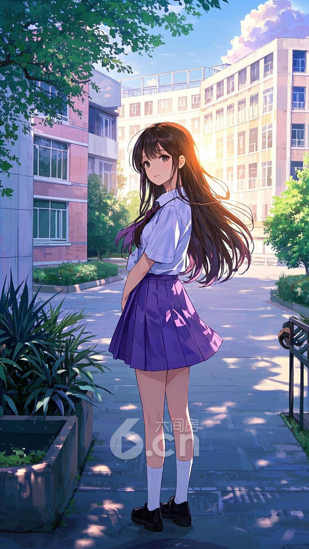 一位年轻的女性,穿着紫色的短裙,长发随风飘动,站在清晨的校园里,背景是晨曦洒下的光辉与绿色的校园,展现她的青春与活力