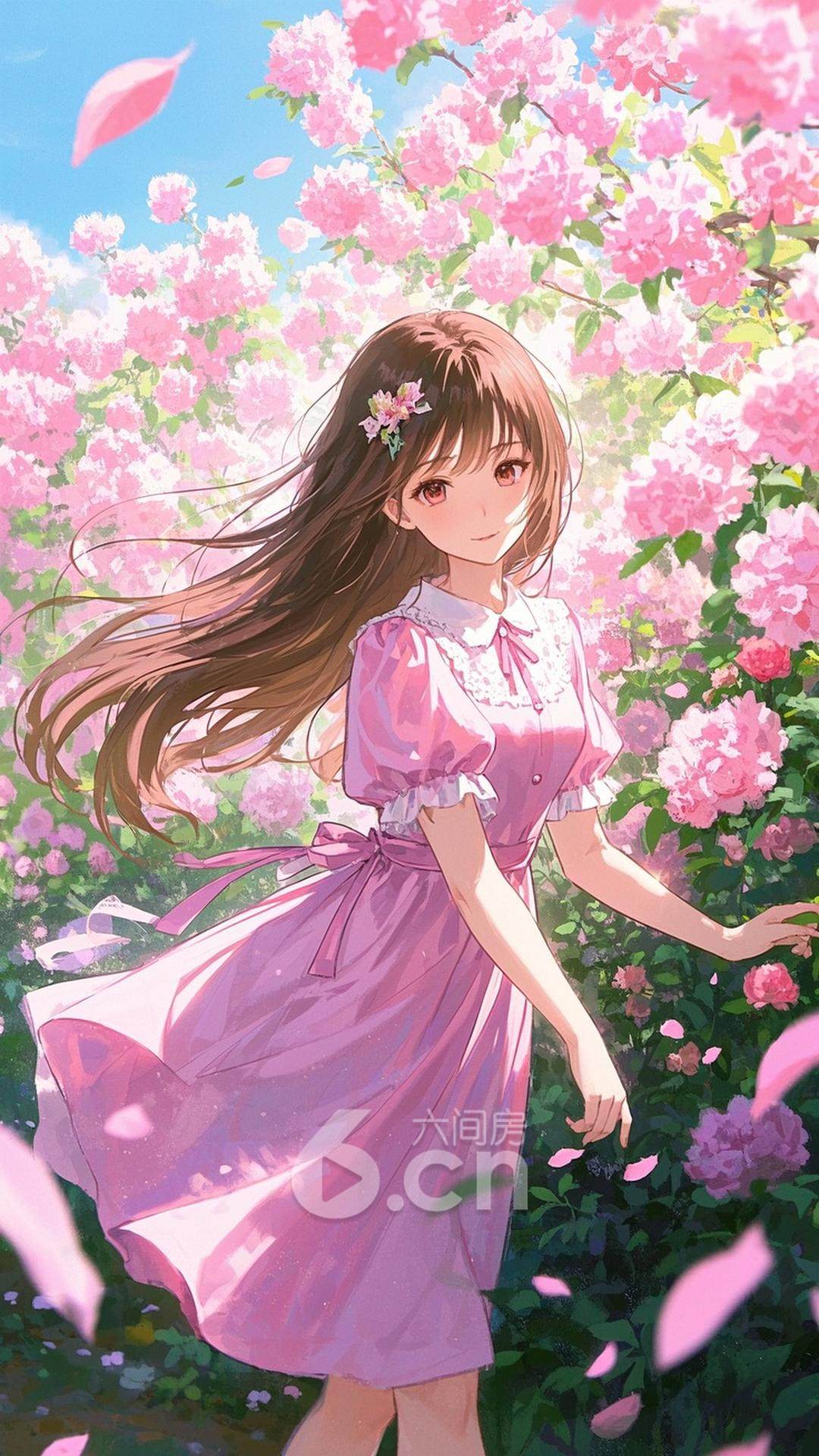 一位女性,穿着粉色的连衣裙,长发随风飘动,站在春天的花田中,背景是盛开的花朵和温暖的阳光,展现她的纯真与柔美气质