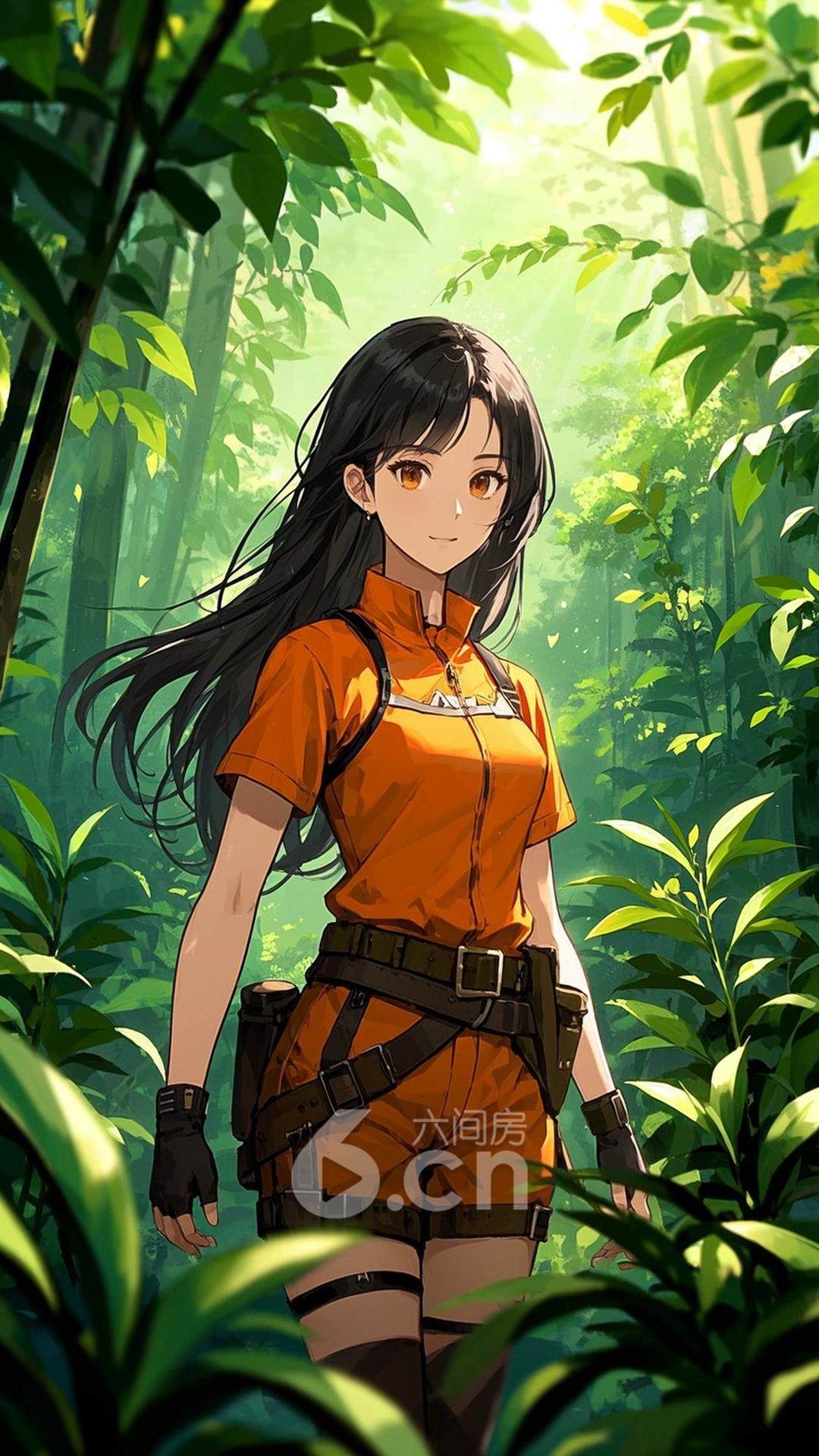一位年轻的女性,穿着橙色的冒险装,长发披肩,站在神秘的丛林深处,背景是阳光透过树叶洒下的光斑与绿意盎然的自然景色,展现她的探险精神与勇敢