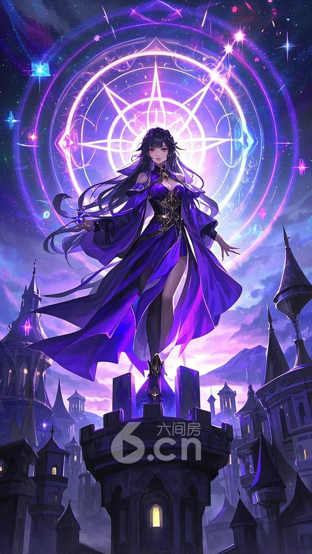 一位女性,穿着华丽的紫色魔法袍,长发披肩,站在光辉的魔法塔顶,背景是五彩斑斓的魔法阵与闪烁的星空,展现她的魔力与神秘感