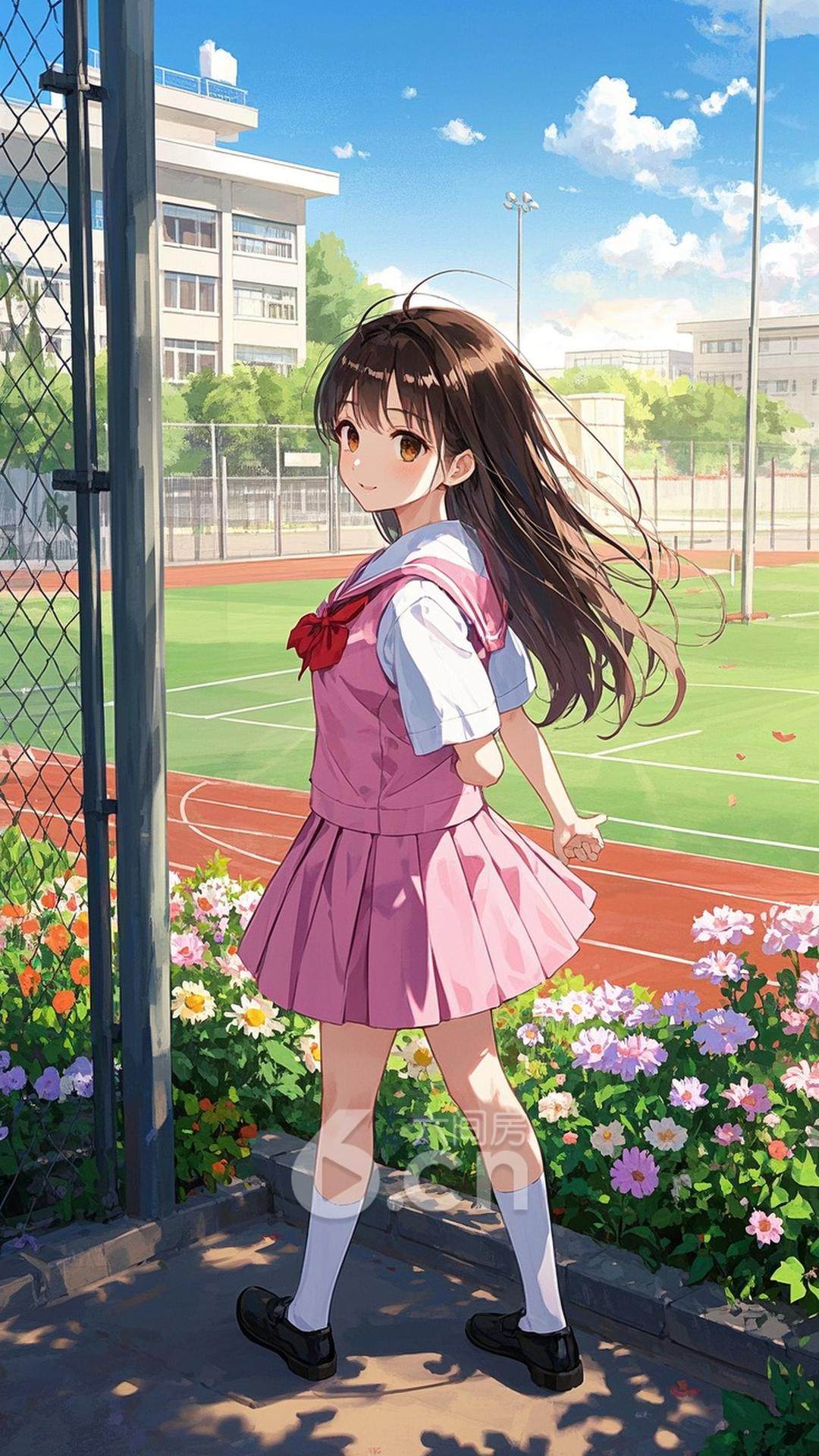 一位年轻的女性,穿着粉色学生制服,长发随风飘动,站在校园的操场上,背景是清晨的阳光与鲜花,展现她的青春与朝气