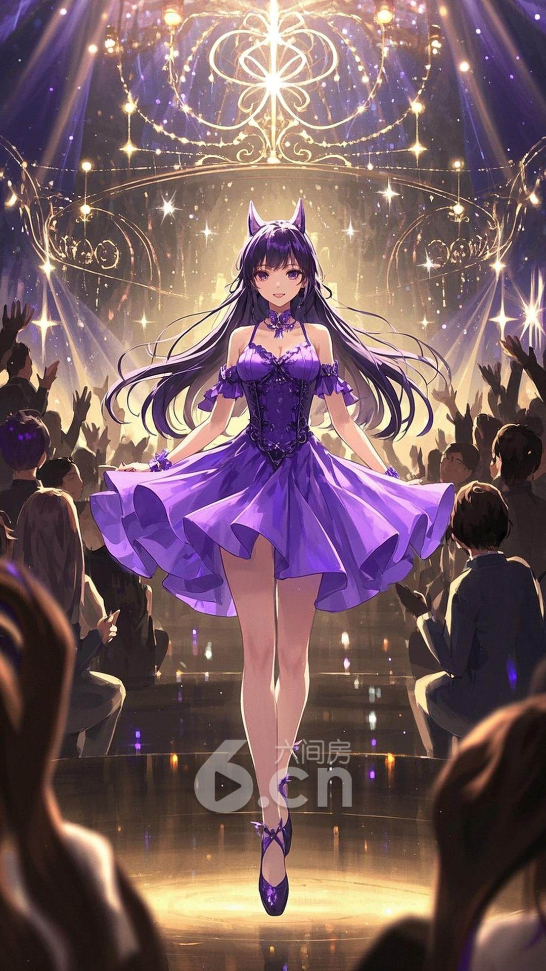 一位年轻的女性,穿着紫色舞裙,长发披肩,站在华丽的舞台中央,背景是闪烁的灯光与热烈的掌声,展现她的舞蹈才华与自信