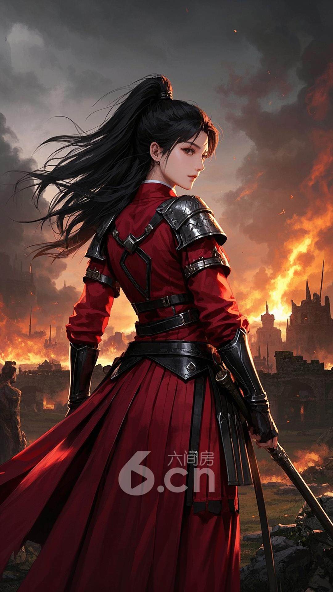 一位女性,穿着红色的战斗服,长发随风飘动,站在古老的战场上,背景是远处的战火与硝烟,展现她的英勇与坚韧