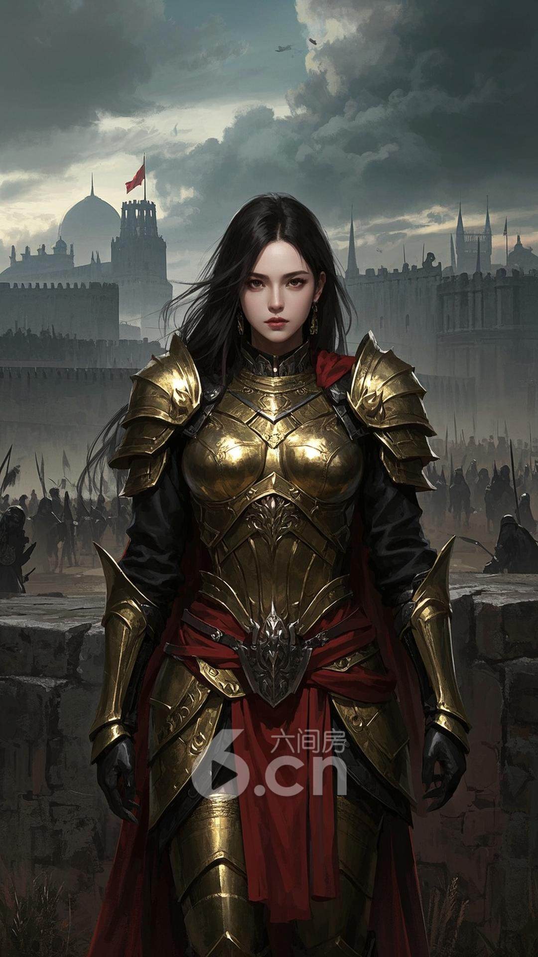 一位女性,穿着金色盔甲,长发披肩,站在古代城墙上,背景是苍茫的战场与暗沉的天空,展现她的决心与勇气