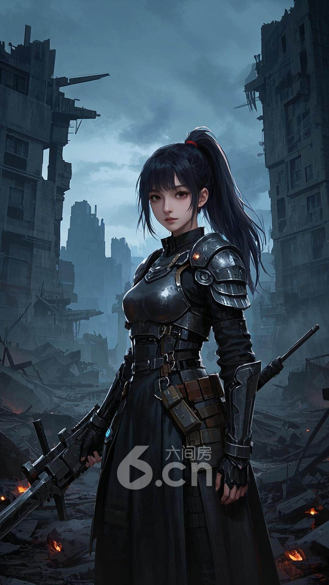 一位年轻的女性,穿着战斗装,长发束成马尾,站在废墟中的战场上,背景是崩塌的建筑与暗沉的天空,展现她的坚韧与无畏