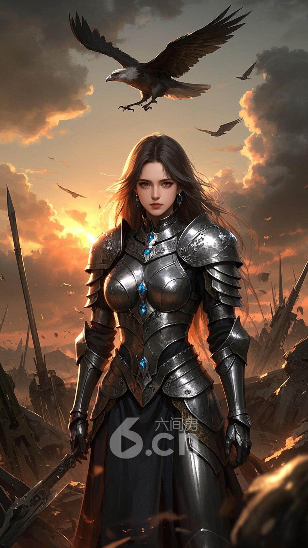 一位女性,穿着银色骑士盔甲,长发随风飘动,站在战场的废墟上,背景是夕阳下的硝烟与飞翔的战鹰,展现她的英勇与坚毅