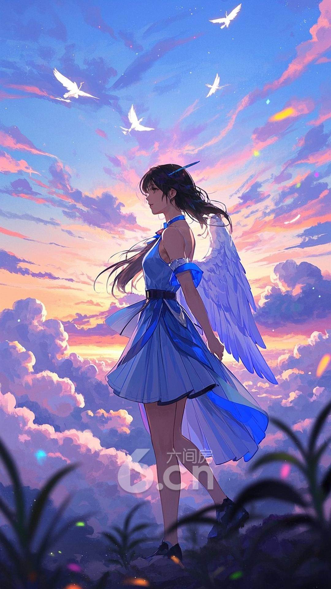 一位女性,穿着蓝色的天使服,长发高束,站在云海中,背景是五彩斑斓的天空与飞翔的光点,展现她的优雅与神圣气息