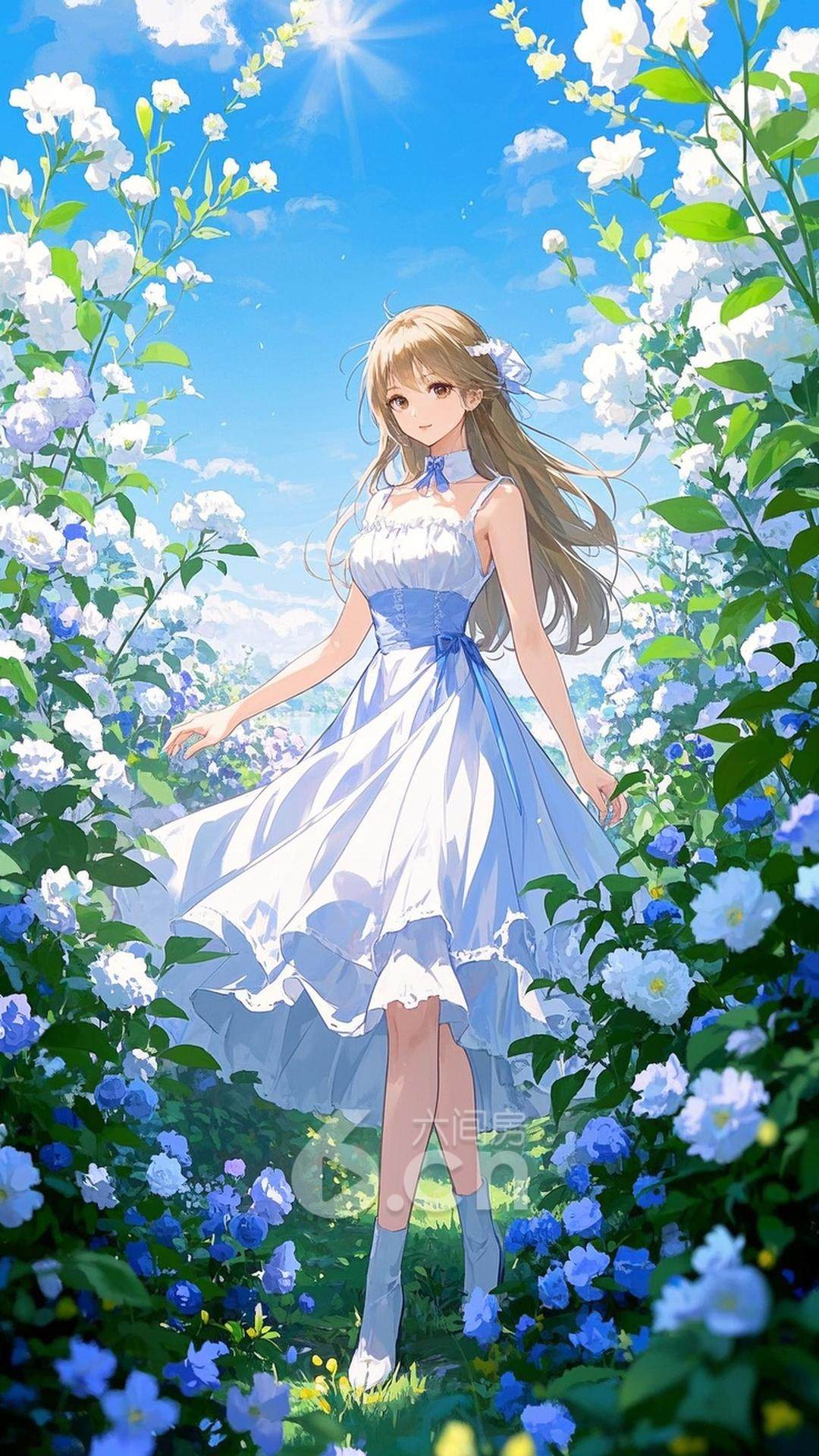 一位年轻的女性,穿着白色的公主裙,长发高束,站在梦幻般的花园中,背景是阳光洒下的花丛与蓝天,展现她的高贵与纯真气质