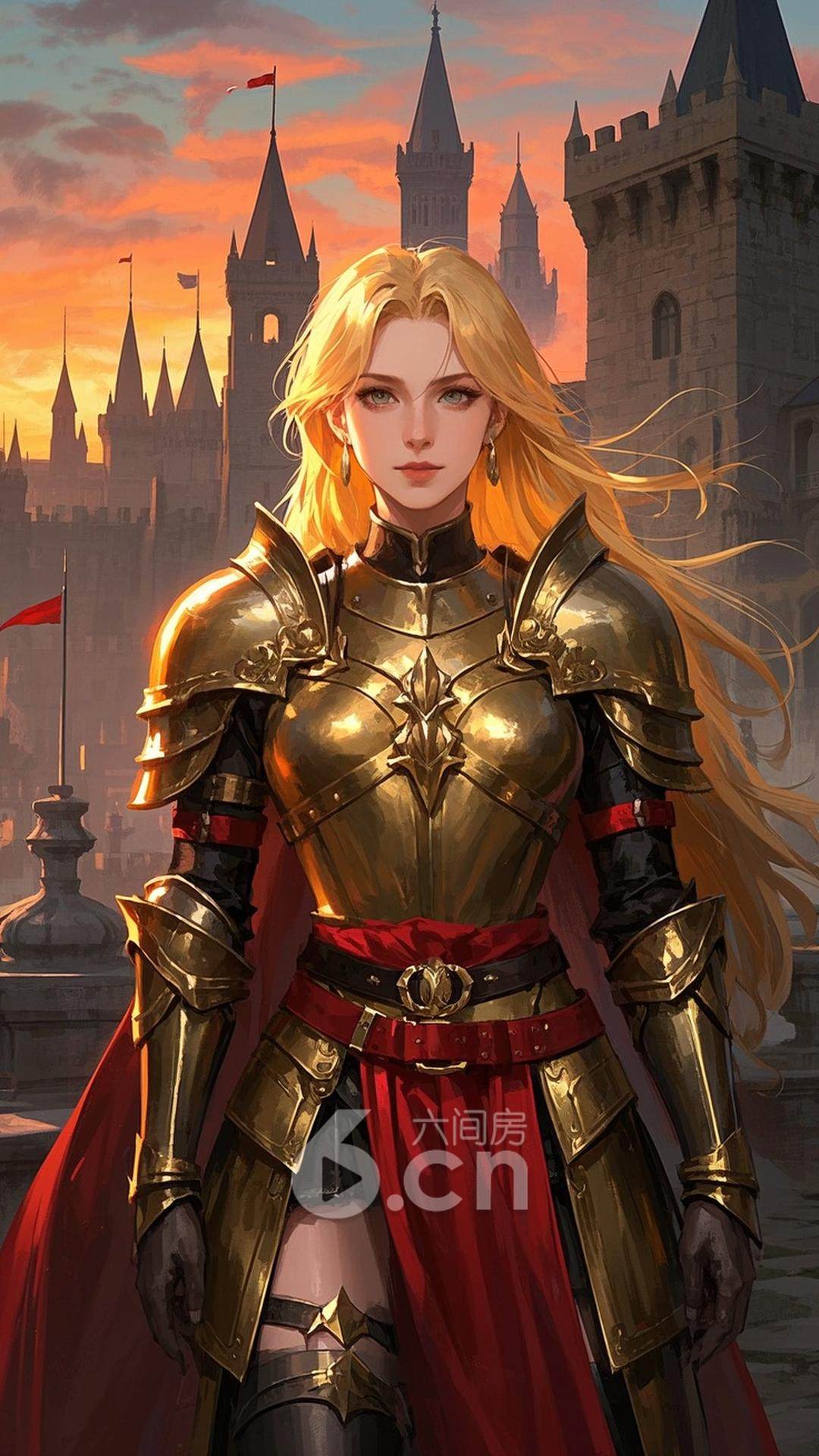 一位女性,穿着金色的战士盔甲,长发披肩,站在古老的城堡前,背景是昏黄的夕阳与飘扬的旗帜,展现她的英勇与不屈