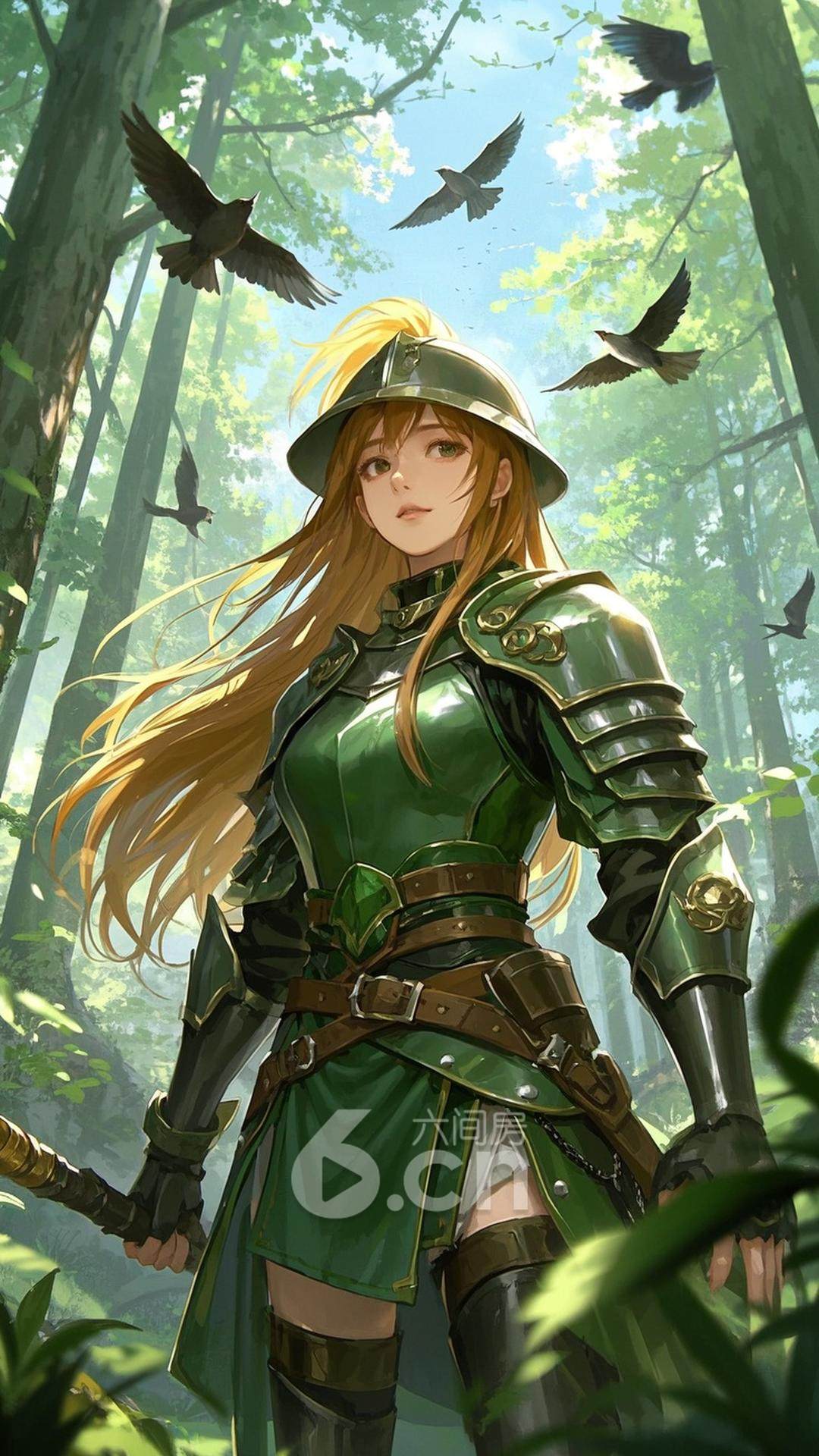 一位年轻的女性,穿着绿色的骑士盔甲,长发披肩,站在森林中的清晨,背景是被阳光洒满的树林与飞舞的鸟群,展现她的勇气与冒险精神