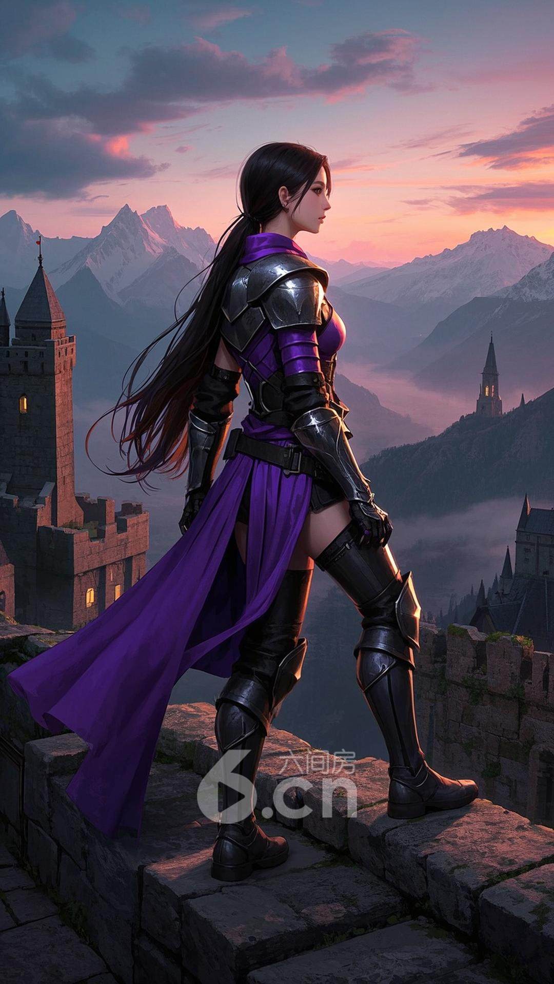 一位年轻的女性,穿着紫色的战斗盔甲,长发高束,站在古老的城堡墙顶,背景是遥远的山脉与苍茫的天空,展现她的勇气与坚强