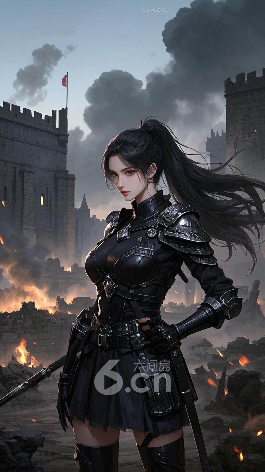 一位女性,穿着黑色的战士装,长发束起,站在古老的战场上,背景是远处的硝烟与破碎的城墙,展现她的英勇与果断