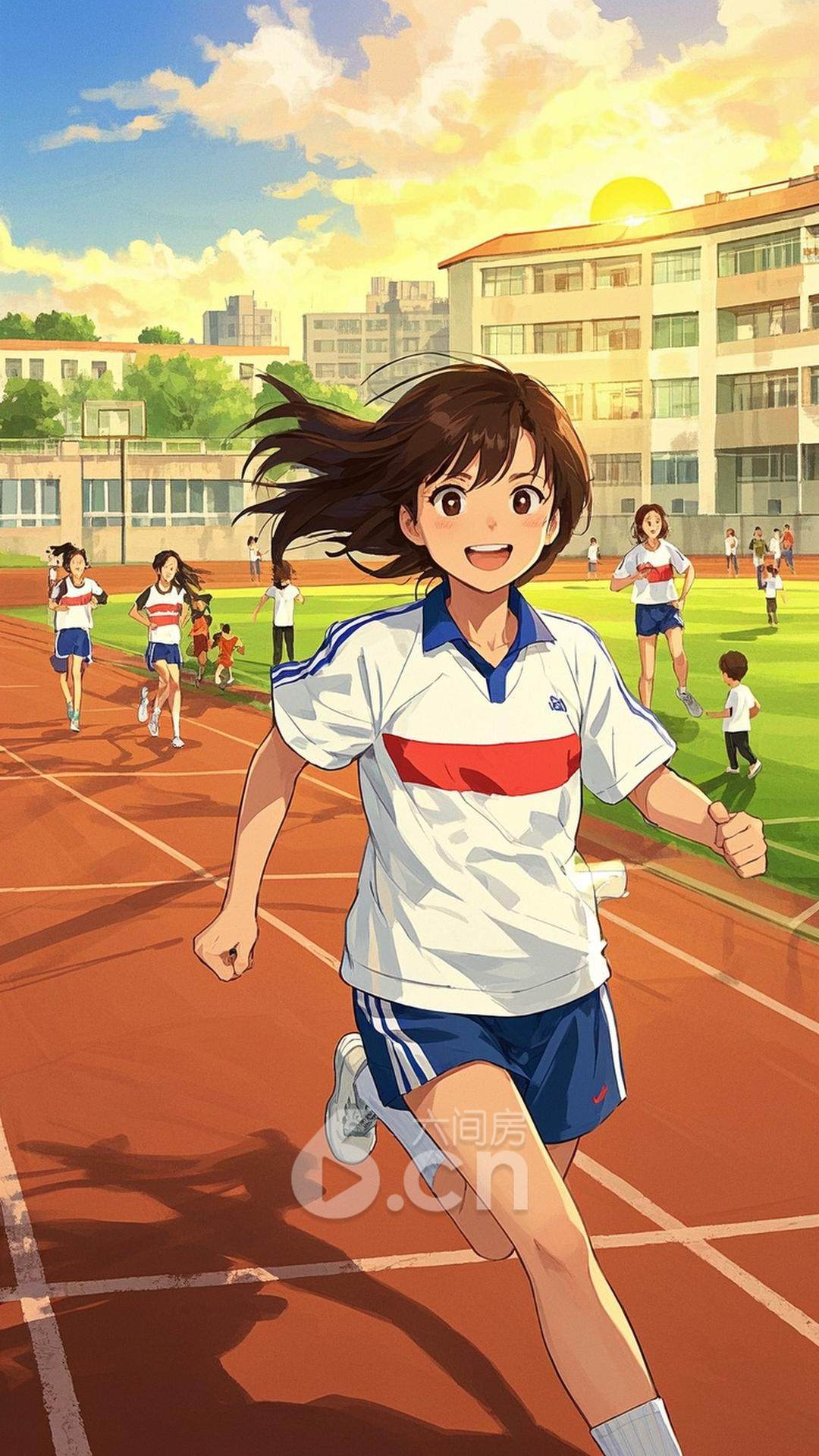 一位年轻的女性,穿着白色运动服,长发束成马尾,站在操场的跑道上,背景是朝阳与同学们的笑声,展现她的活力与拼搏精神