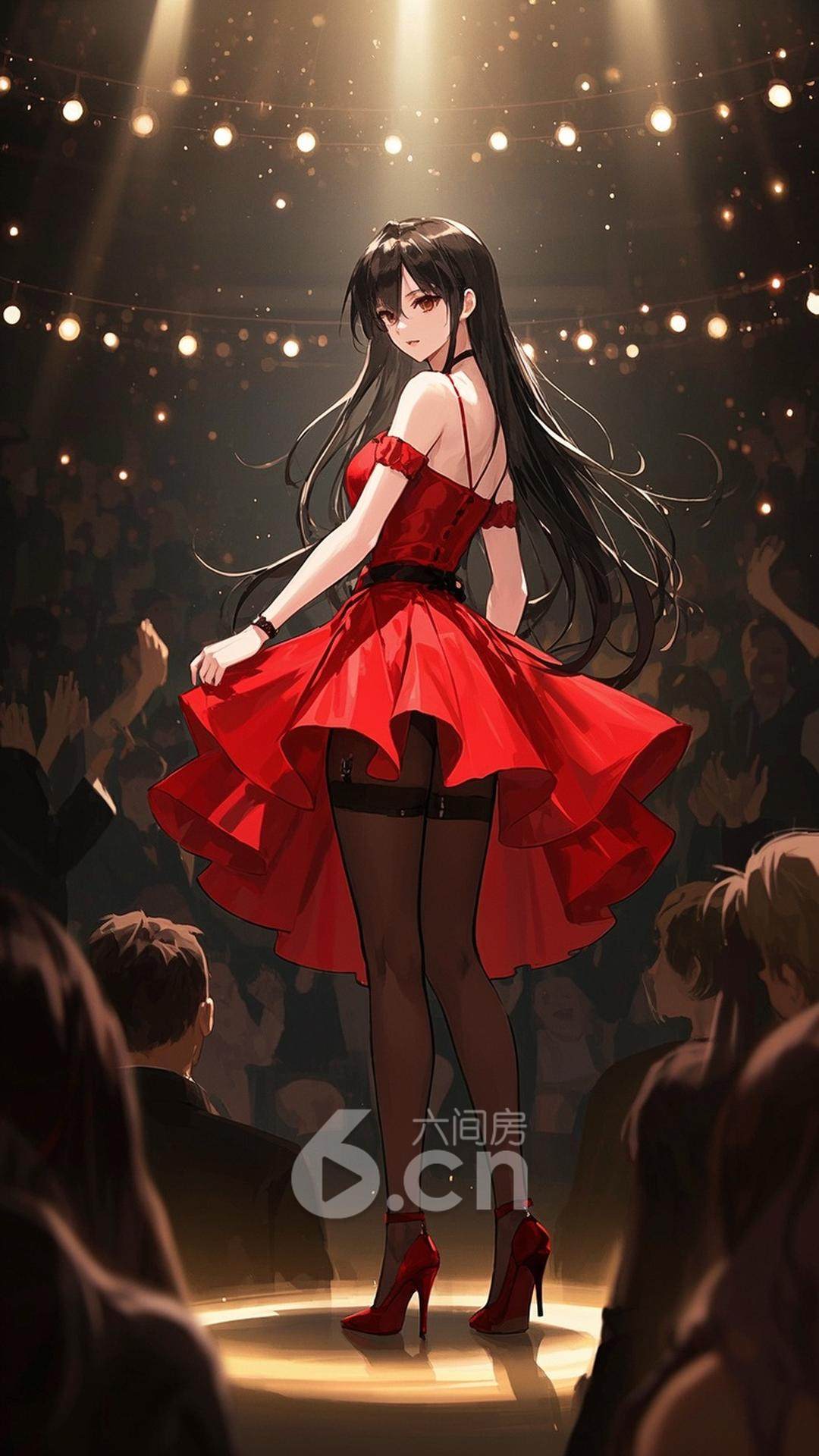 一位年轻的女性,穿着红色舞裙,长发披肩,站在舞台上,背景是聚光灯与观众的掌声,展现她的优雅与自信