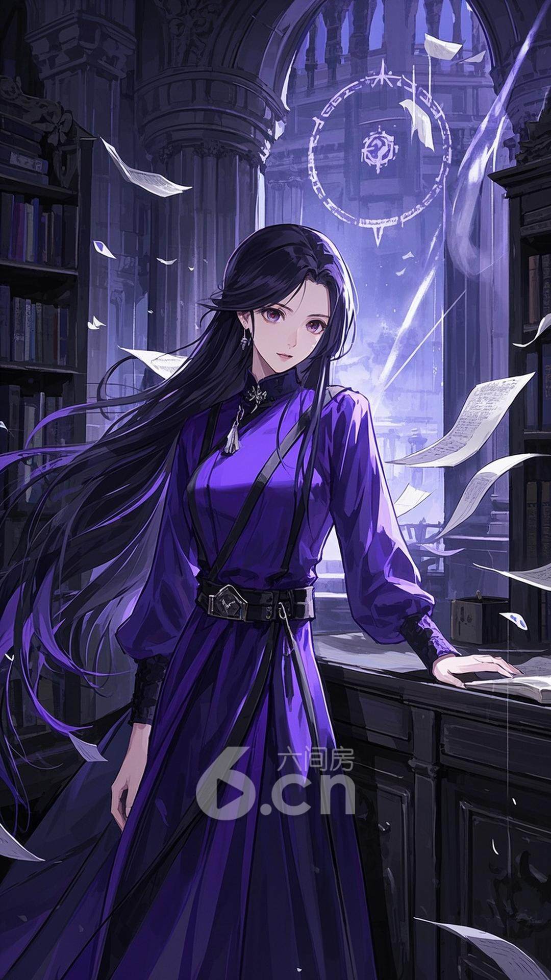 一位年轻的女性,穿着紫色的长袍,长发披肩,站在古老的图书馆前,背景是飘动的书页与神秘的符文,展现她的智慧与神秘感