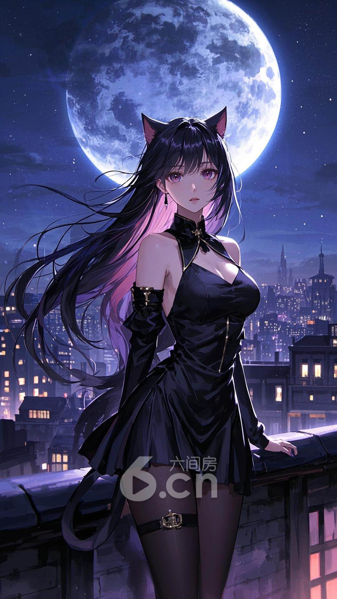 一位女性,穿着黑色的猫耳装,长发随风飘动,站在月光下的屋顶,背景是星空与夜晚的城市,展现她的神秘与灵动气质