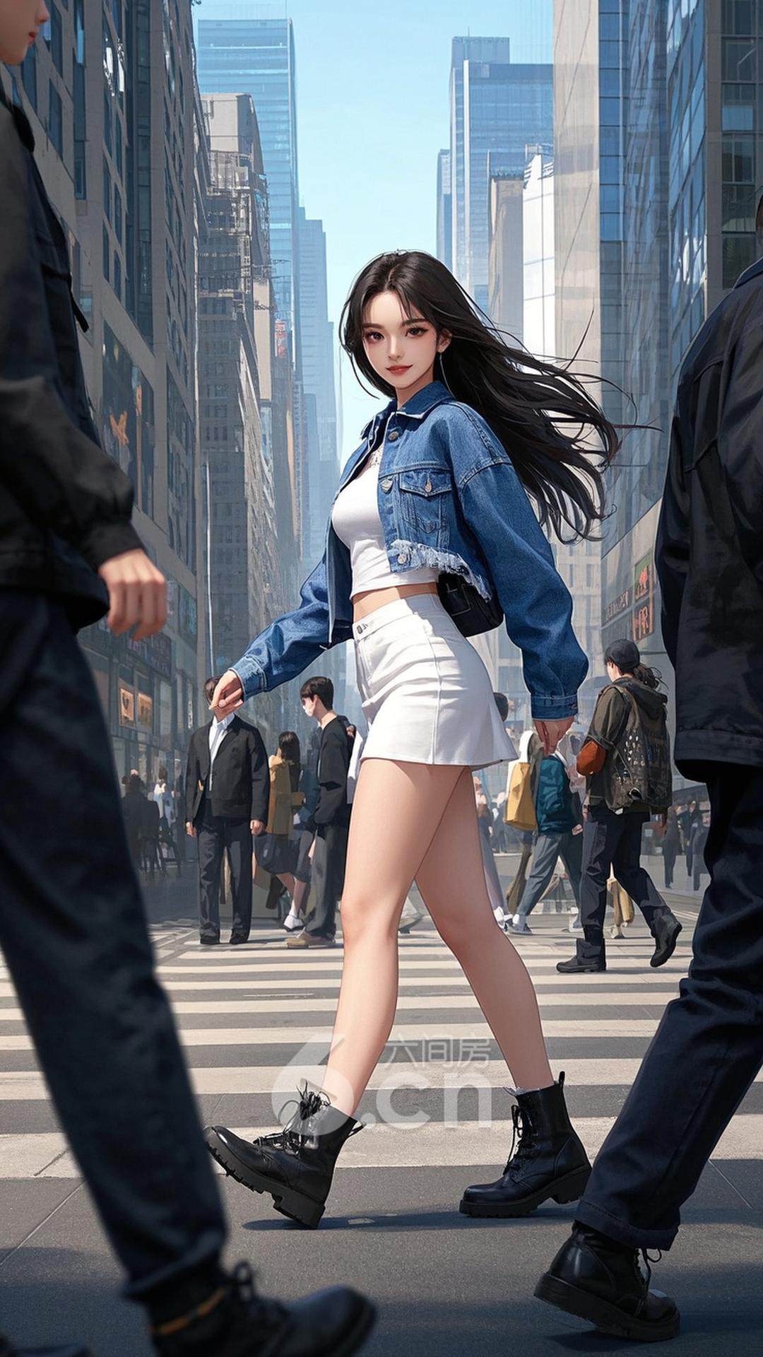 一位年轻的中国女性,穿着白色短裙和牛仔外套,长发随风飘动,长腿修长,正走在时尚的街头,背景是繁忙的城市街景,展现她的活力与现代韩流风格