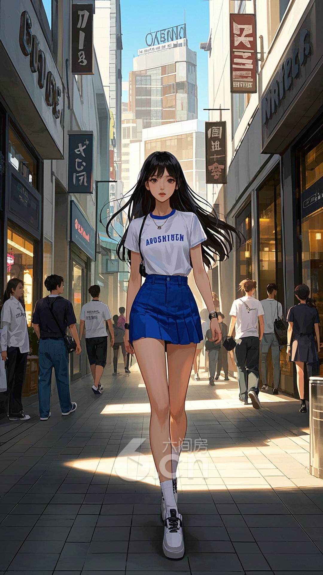 一位年轻的中国女性,穿着蓝色短裙和白色T恤,长发随风飘动,长腿修长,正走在繁华的购物街,背景是时尚的商店和街道景象,展现她的活力与韩流风格