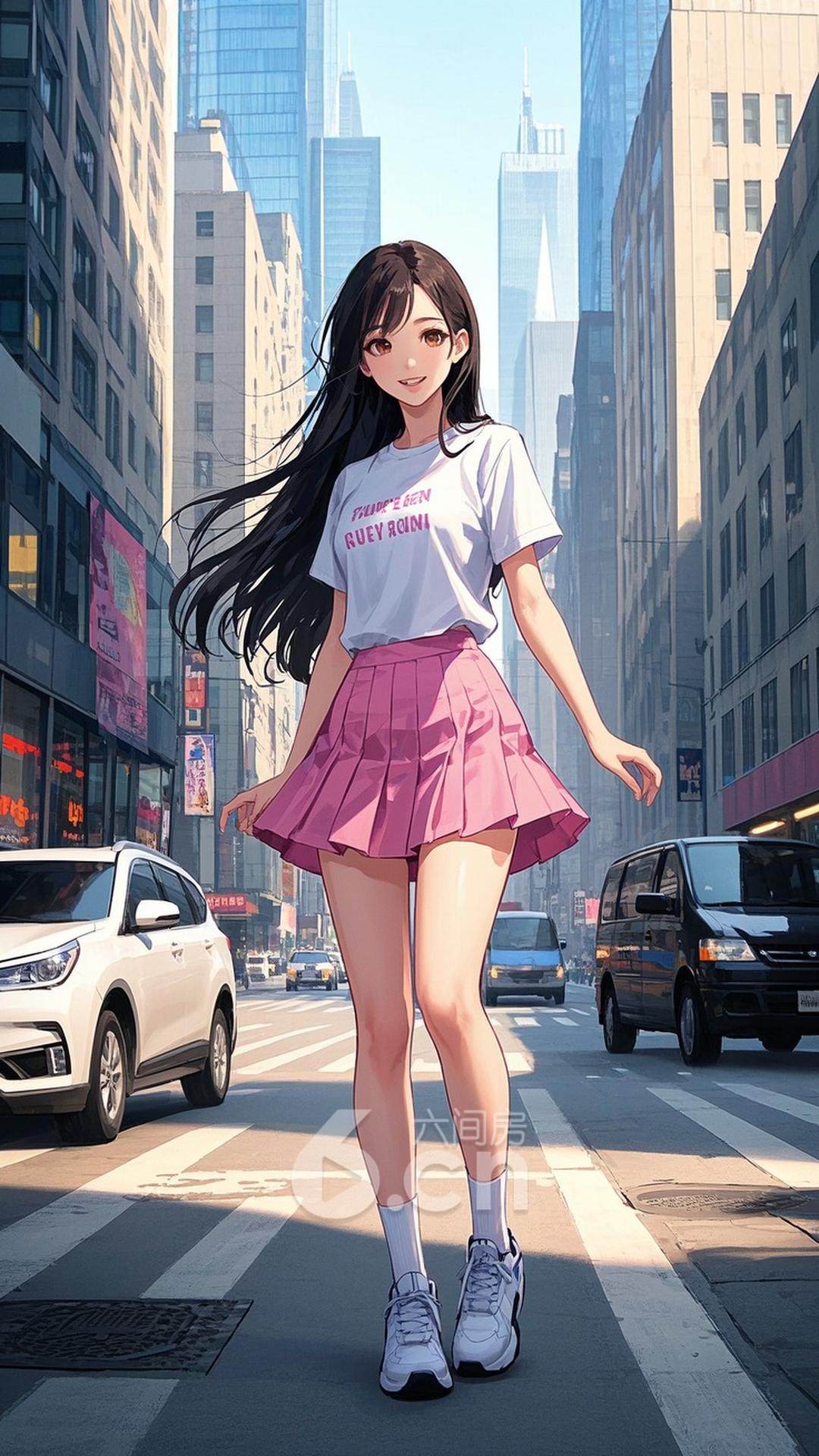 一位穿着粉色短裙和白色T恤的中国女性,长发自然垂落,长腿修长,正站在时尚的街头,背景是繁忙的城市景观,展现她的清新与现代感