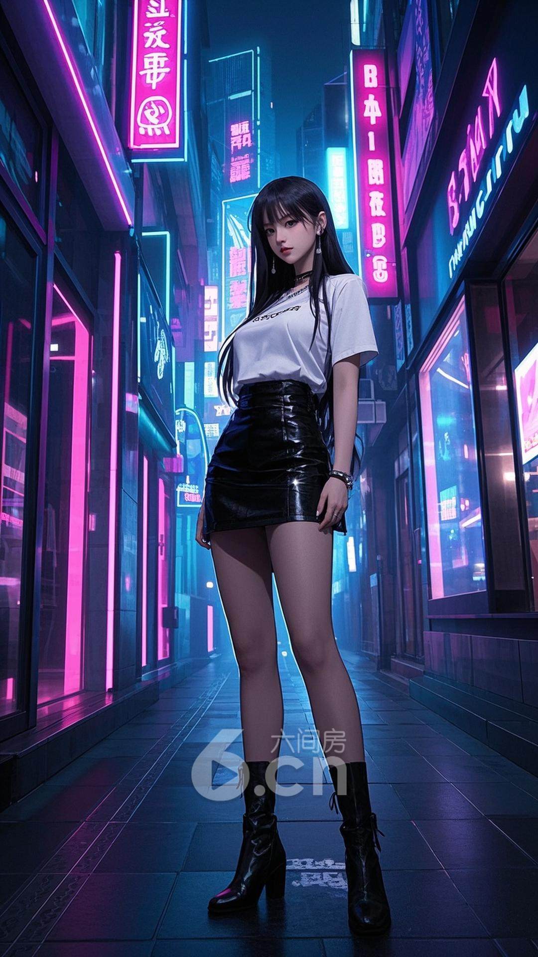 一位年轻的中国女性,穿着黑色皮裙和白色T恤,长发披肩,长腿修长,正站在现代城市街头,背景是充满时尚感的商店和霓虹灯,展现她的清新与时尚气息