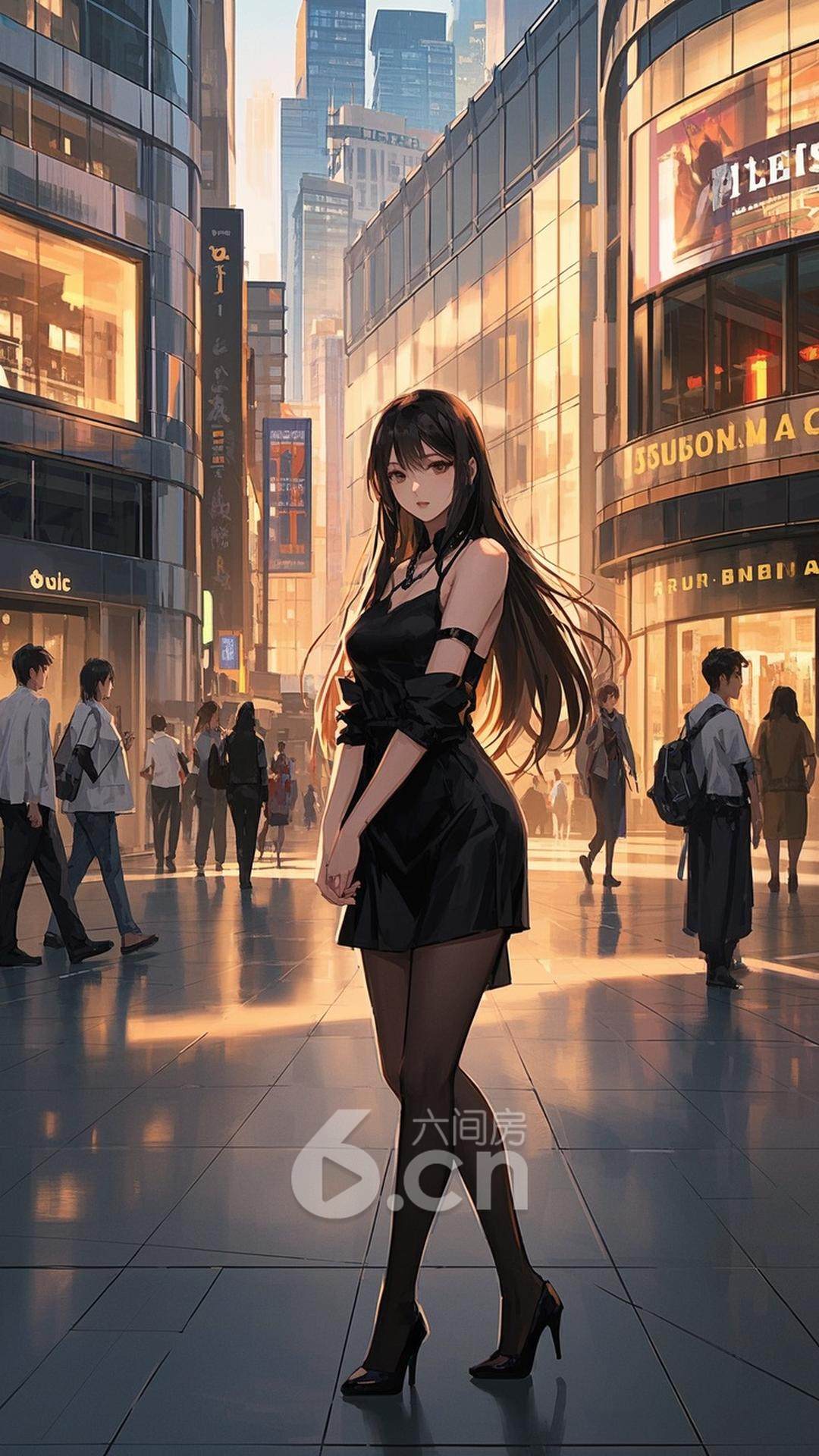一位穿着黑色连衣裙的中国女性,长发披肩,长腿修长,正站在时尚的都市广场上,背景是现代商店和繁忙街道,展现她的优雅与青春气息