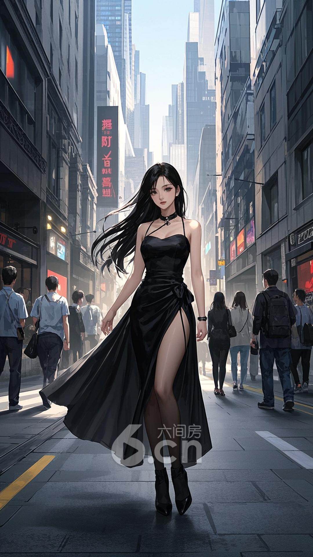 一位穿着时尚黑色长裙的中国女性,长发披肩,长腿修长,正站在现代化的都市街道上,背景是繁忙的街道和现代商店,展现她的优雅与活力