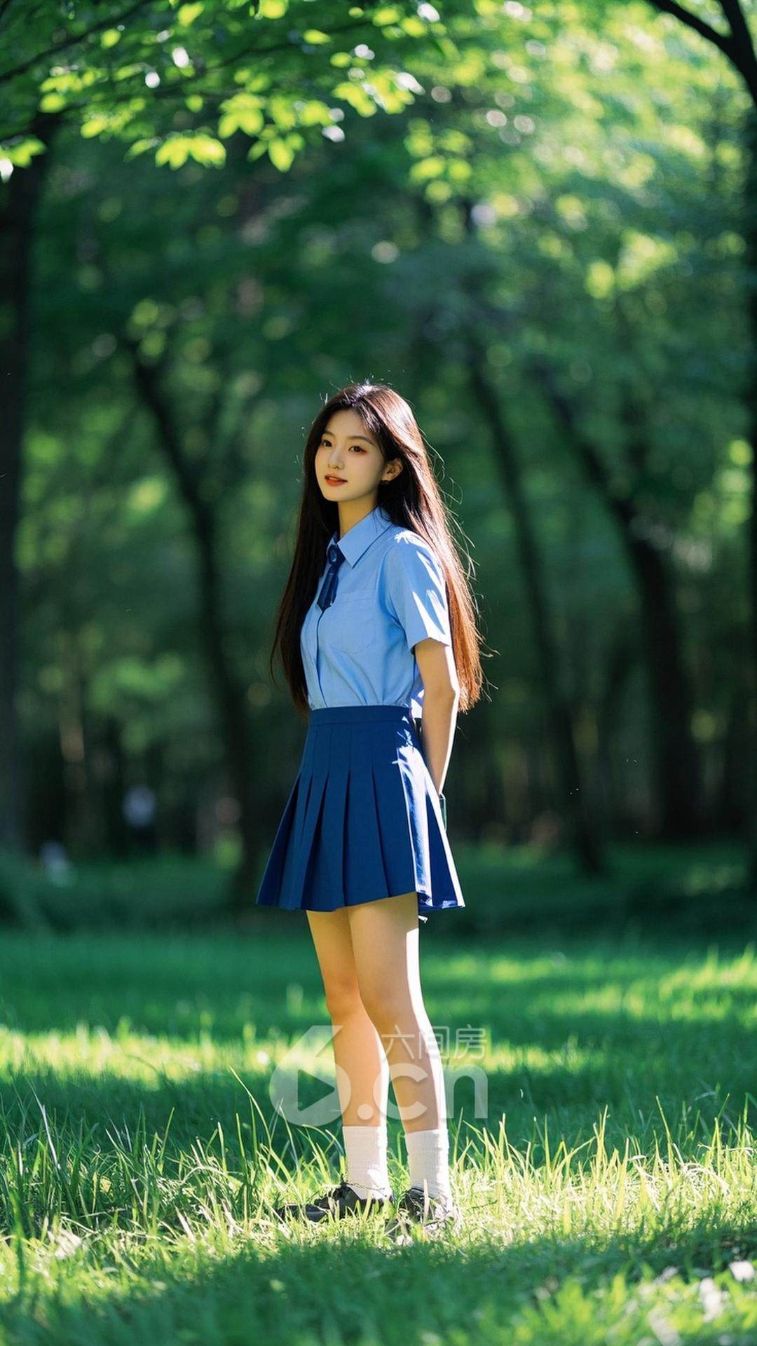 一位年轻的中国女性,穿着蓝色短裙,长发披肩,站在阳光透过树叶洒下的草地上,背景是绿树成荫的森林,展现她的清新与自然美