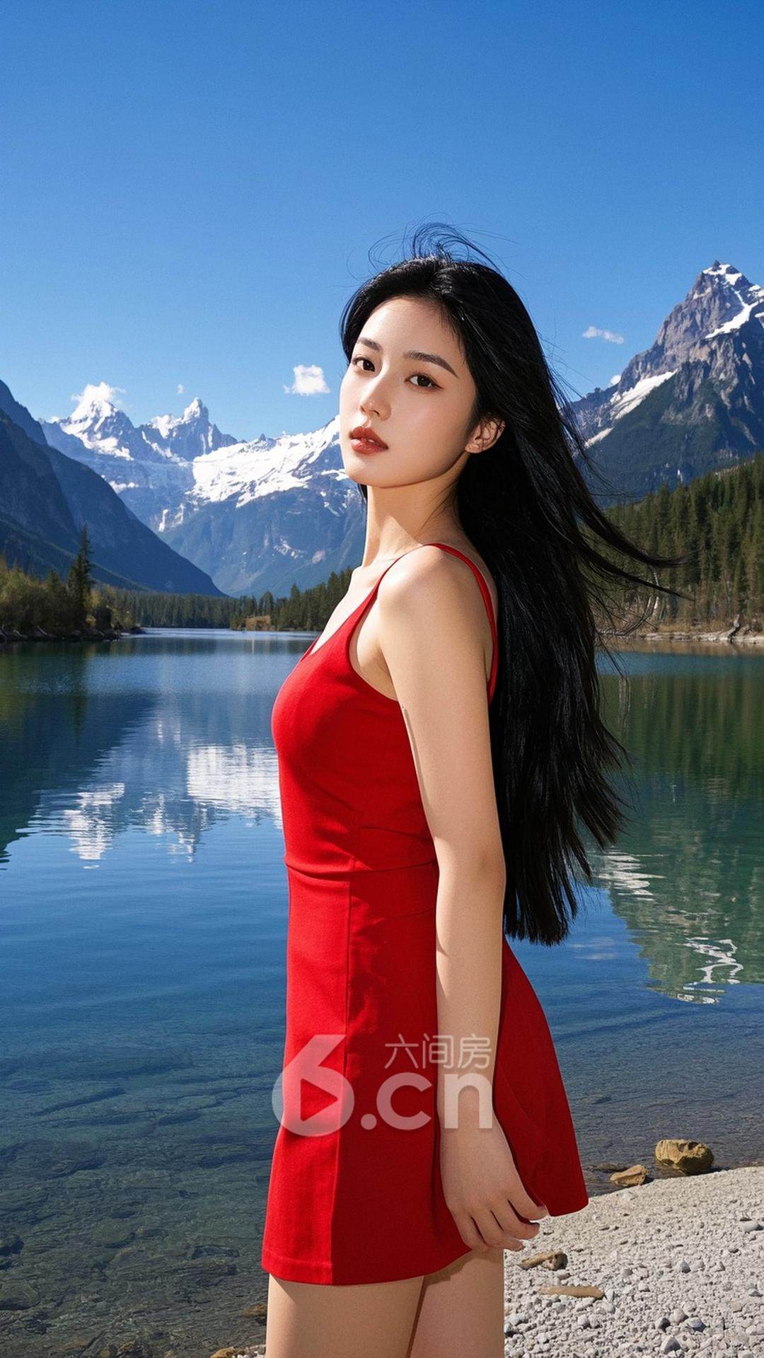 一位年轻的中国女性,穿着红色短裙,长发随风飘动,站在阳光下的湖边,背景是湖水与山脉,展现她的青春与活力