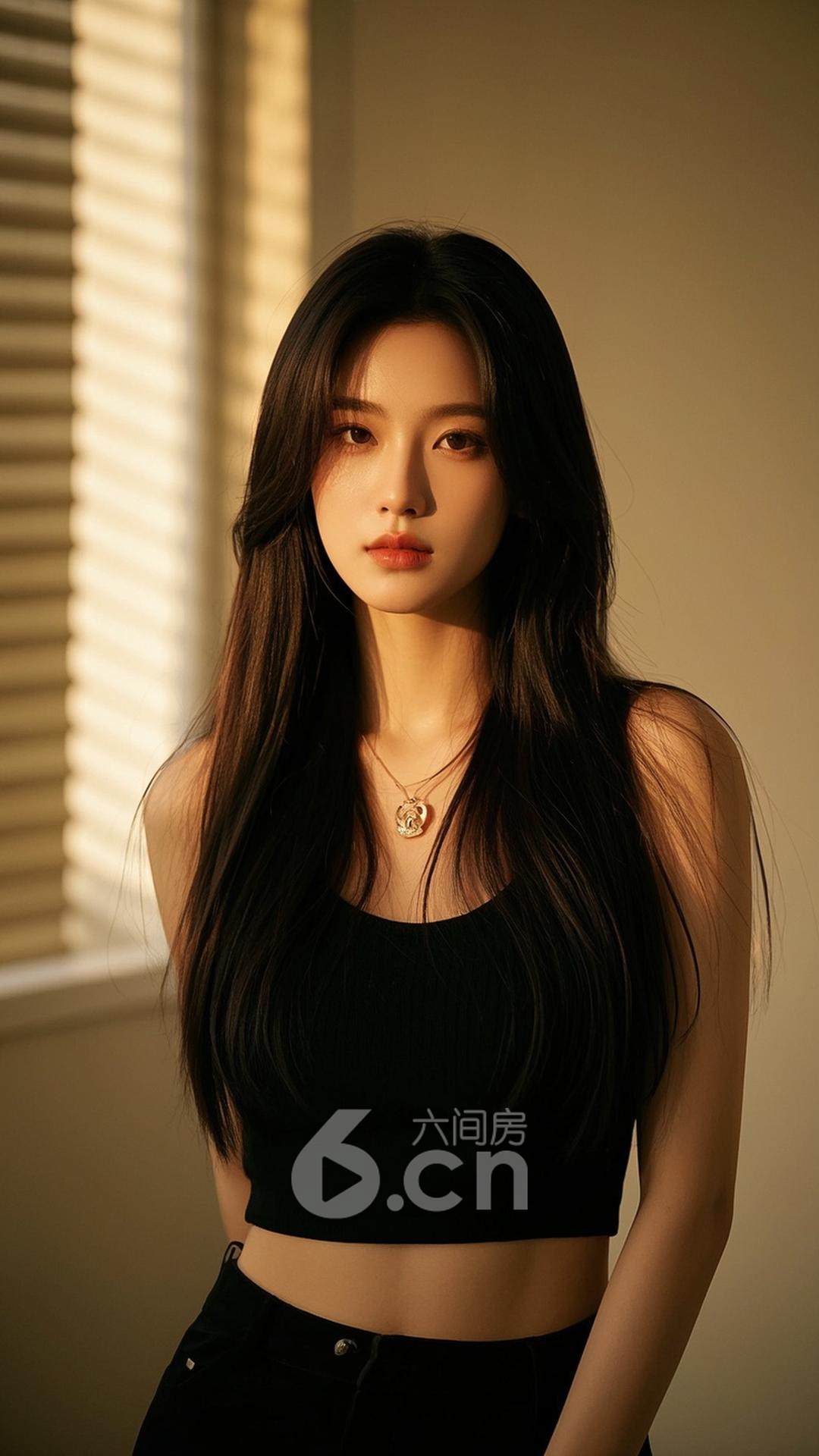 一位女性,穿着黑色短裙,长发自然披肩,站在阳光透过窗帘洒进的房间中,背景是温暖的室内光线,展现她的柔美与舒适感