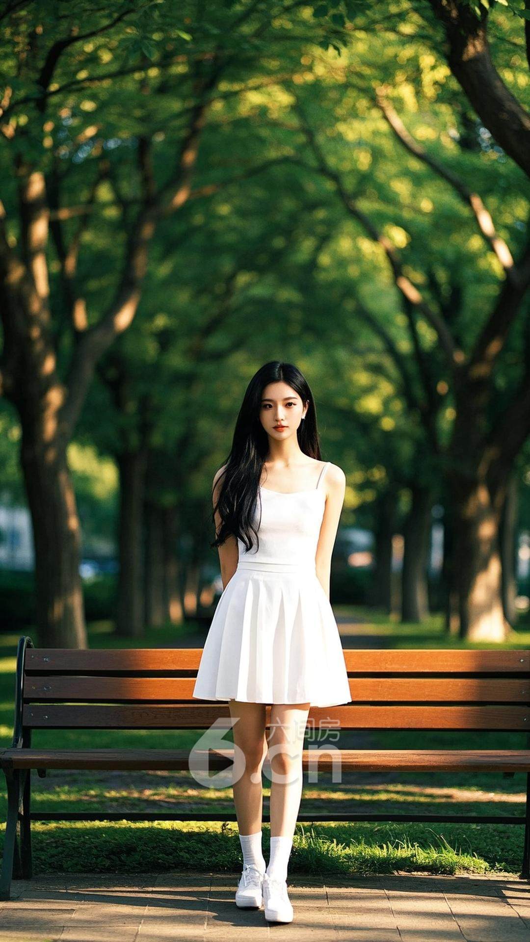 一位女性,穿着白色短裙,长发披肩,站在阳光透过树叶洒下的公园长椅上,背景是绿树和温暖的阳光,展现她的优雅与宁静气质