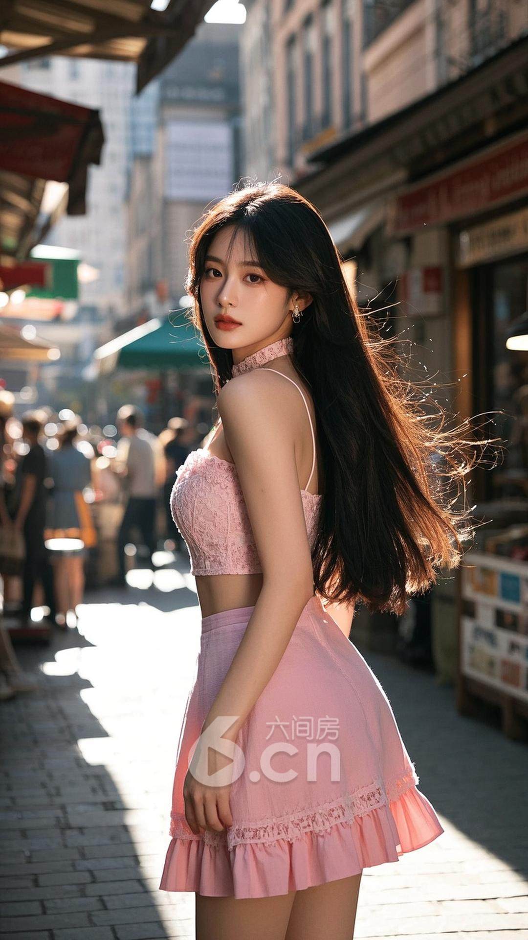 一位女性,穿着粉色短裙,长发随风飘动,站在阳光明媚的城市角落,背景是繁华的街道与热闹的市场,展现她的自信与都市风情